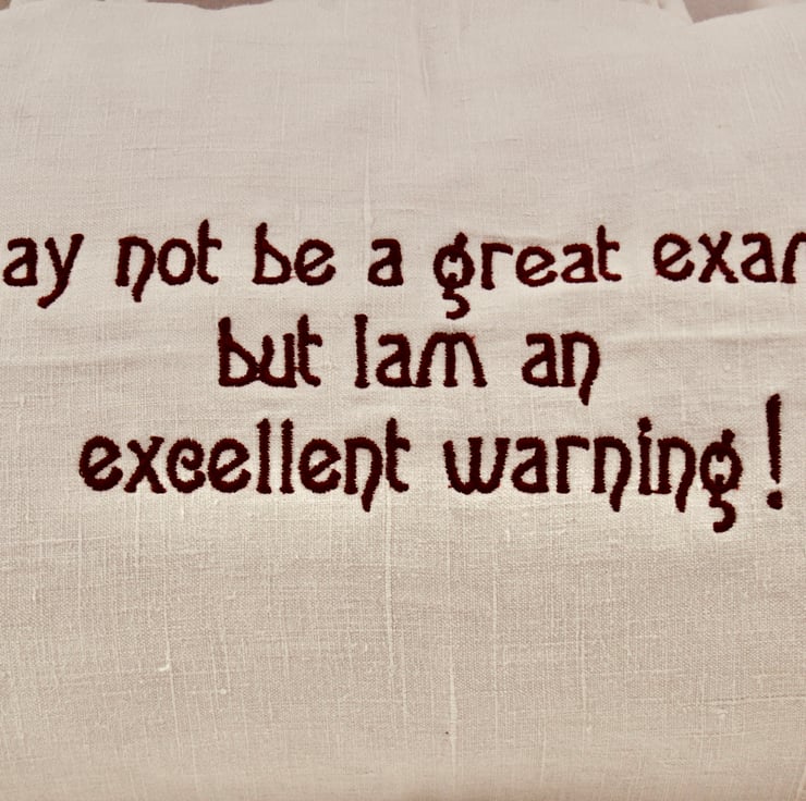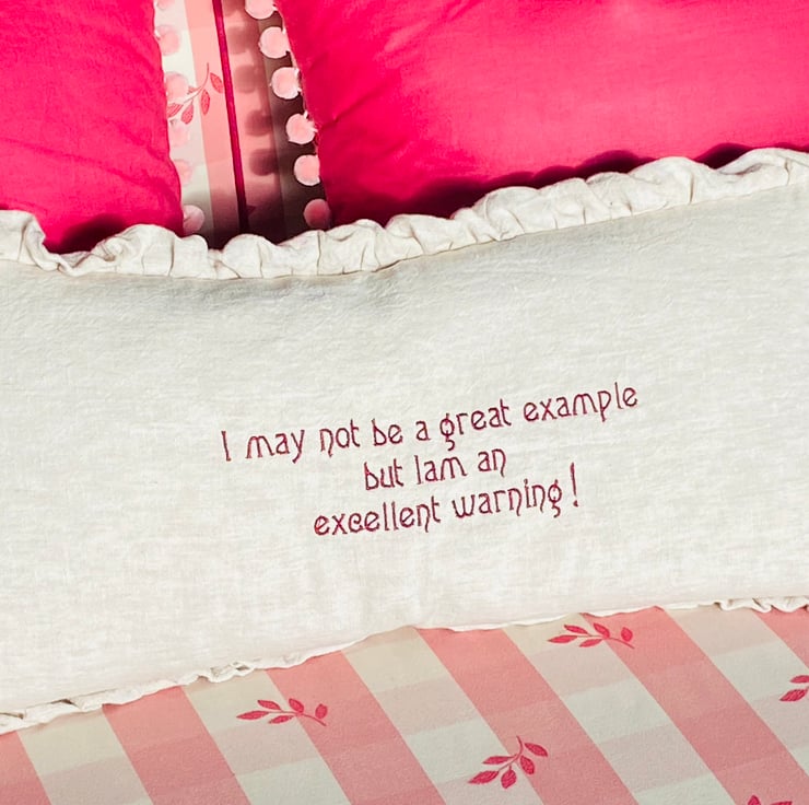 I May Not be A Great Example. . . Embroidered 12" x 24" Cushion made from recycled french linen sheets. For years I have collected these sheets when available and the linen is such great quality. Now I am turning them into fun cushions and I think you probably have someone in your life who would be tickled to receive this. The back is the same natural linen, the embroidery is in a deep maroon and has a feather filled inner with an invisible zip. Trimmed with a double frill. All my cushions have been prewashed and made to the highest standard.