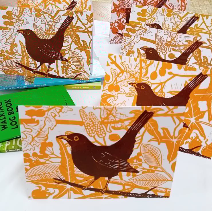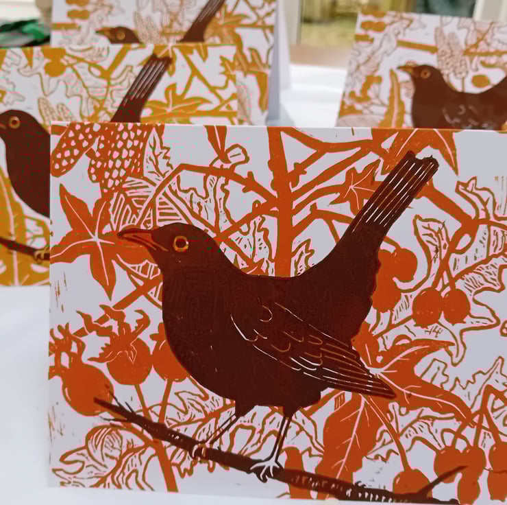 A Lino Print greetings card featuring a Blackbird with a winter foliage background, including Ivy, Rosehips, Oak leaves and winter berries.
