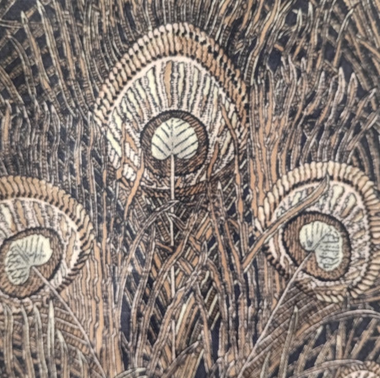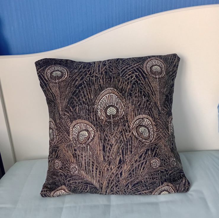 Cushion cover made in Liberty linen union, upholstery weight fabric, in the "Hera" feather pattern, in black, brown and beige.