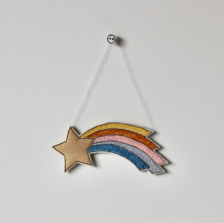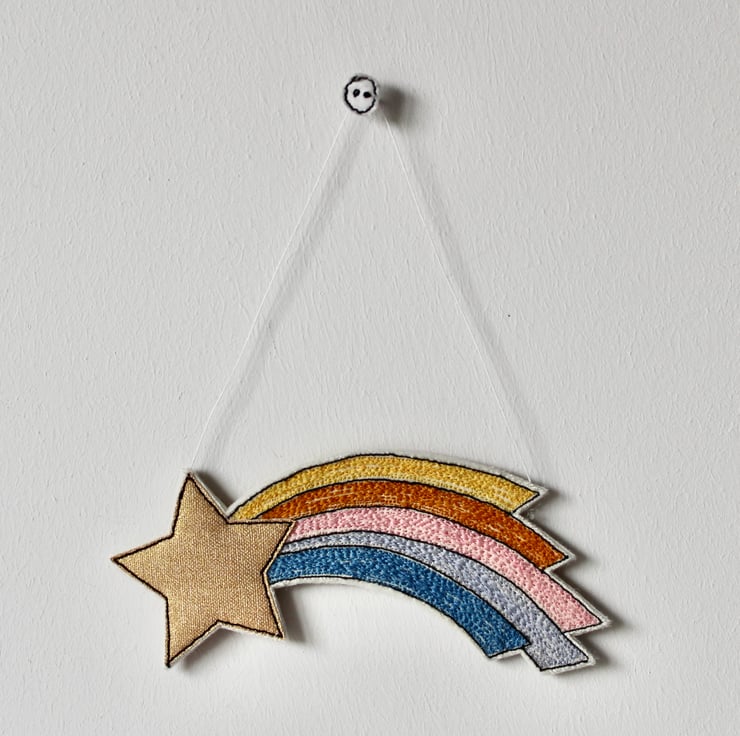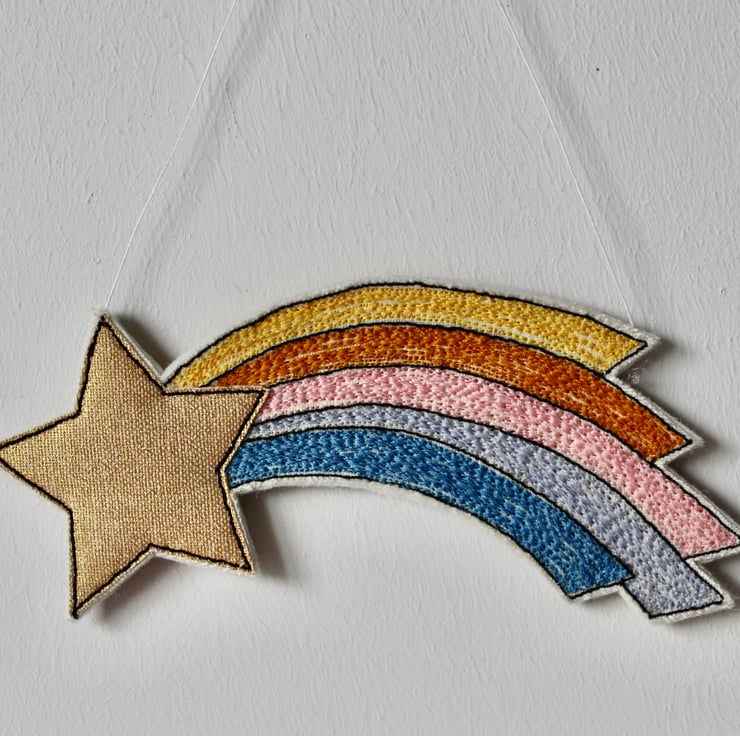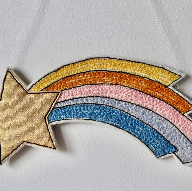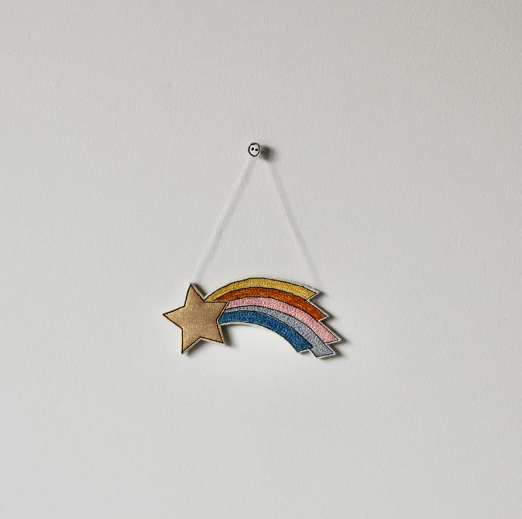'Shooting Star' hanging decorations are sewn using cotton cloth, metallic cloth, 100% wool felt and free hand machine embroidery; multiple layers of cloth are sewn together and cut out by hand using sharp scissors.