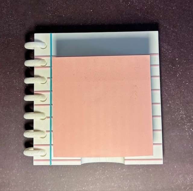 This 3D-printed Post-it note holder, styled like a textbook, fits 3x3-inch notes perfectly. It was made at home on my Bambu Lab A1 using high-quality Bambu PLA filament in white, pale pink, and turquoise. Credit goes to The Carrie Files on Etsy, who provided written permission to sell printed items from this file. The holder measures 4.5 inches in height, 4.5 inches in width, and 0.5 inches in depth.
