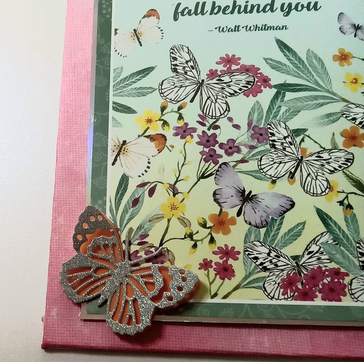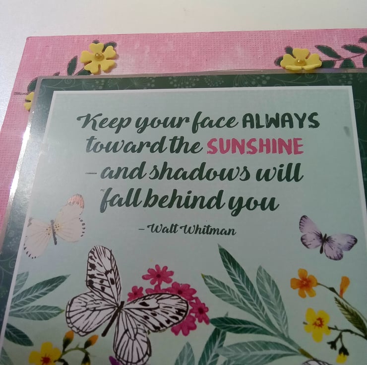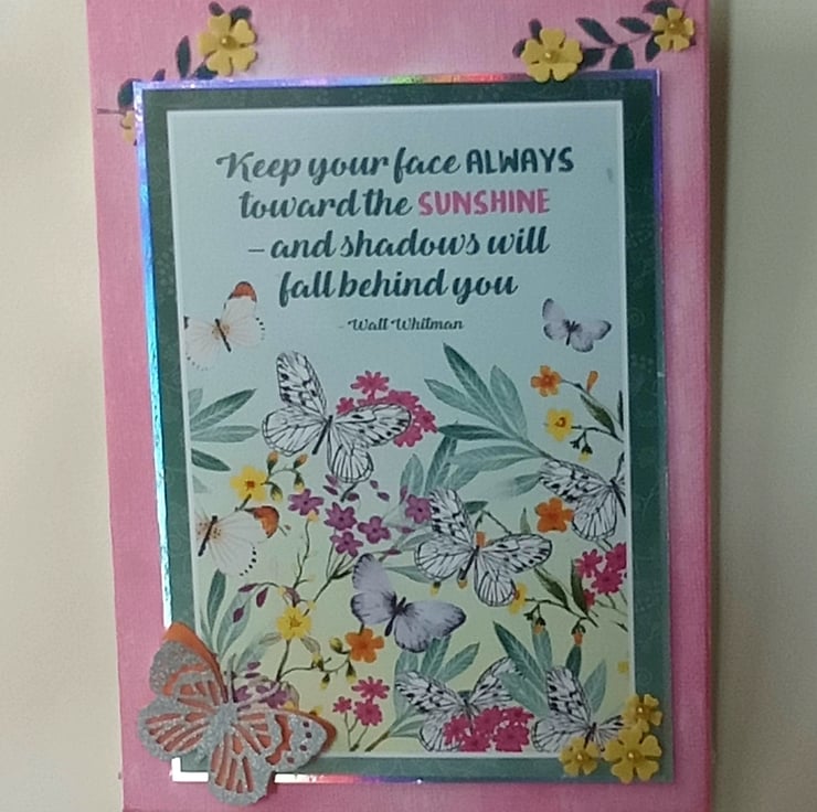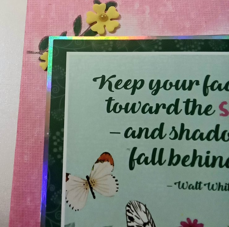 I painted the canvas board pink using a sponge to give a mottled effect, the stamped green leaves in the top corners. The main topper has been layered onto silver foiled card, it features an image of butterflies amongst flowers and foliage with a quote by Walt Whitman "Keep Your Face Always Toward The Sunshine and Shadows Will Fall Behind You" I have die cut tiny flowers from thin foam and added them to the canvas and topper finishing them with faux pearl centres, a die-cut double layered butterfly has been added to the bottom left corner.