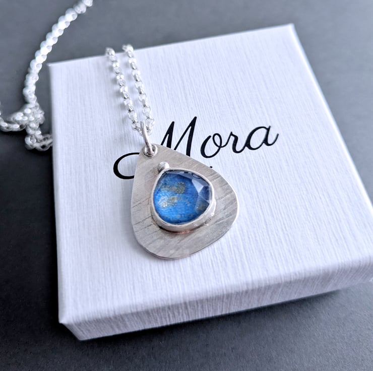 The lapis lazuli is a doublet stone in which a layer of lapis is covered by a layer of rose cut crystal which protects the stone underneath. It has a very distinctive appearance - magnifyiong the markings in the lapis and giving a lovely sparkle.