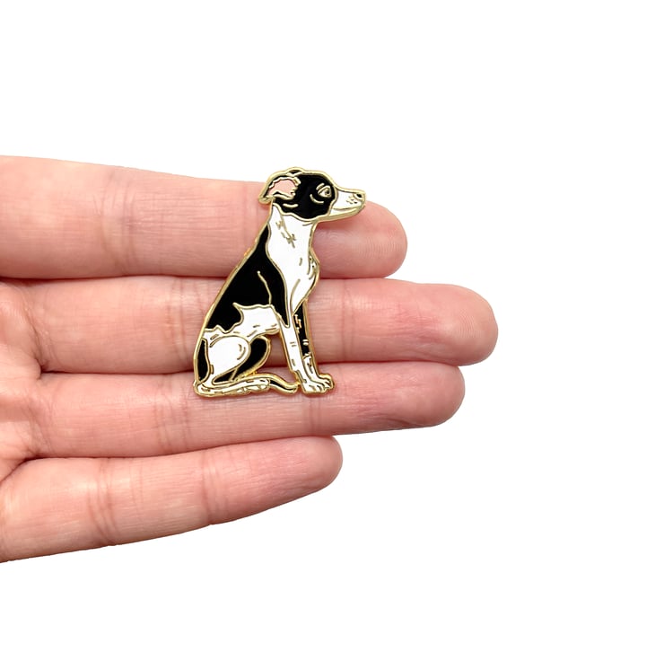 A beautiful hard enamel Whippet pin badge. Based on my BESTSELLER earrings!
