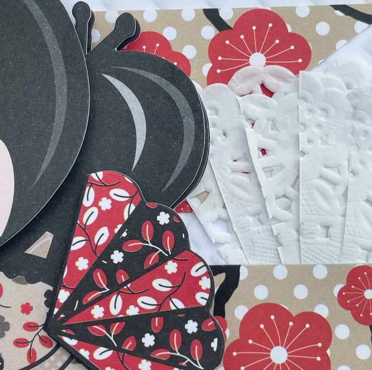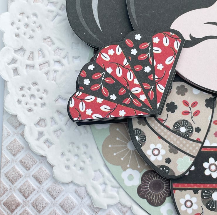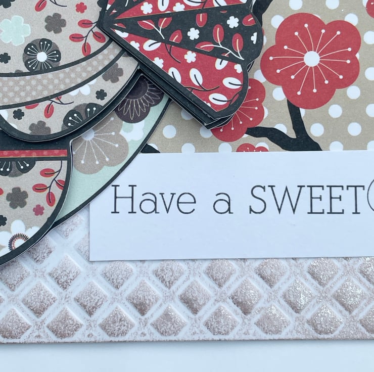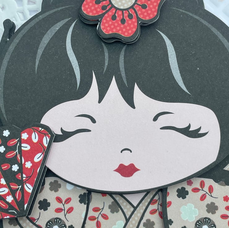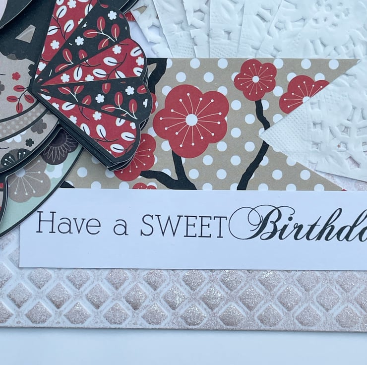 A lovely and cute Kokeshi style doll birthday card. This A5 sized card has an embossed base card in a diamond pattern. This has been enhanced with rose gold gilding wax around the whole border. The main image is a deeply decoupaged image of a Kokeshi doll, this one is called Serenity. She is in a beige and brown floral kimono holding 2 red and black fans. She has a red flower in her hair. She is sitting on 2 banners in matching floral paper and doilies for added femininity. The greeting says Have a Sweet Birthday. Inside has the greeting Have a wonderful day.