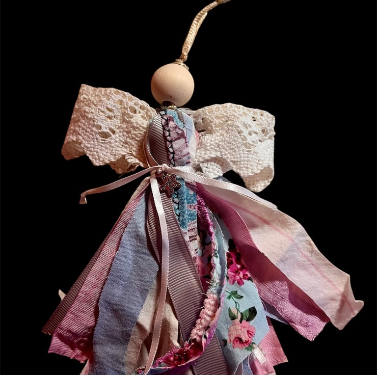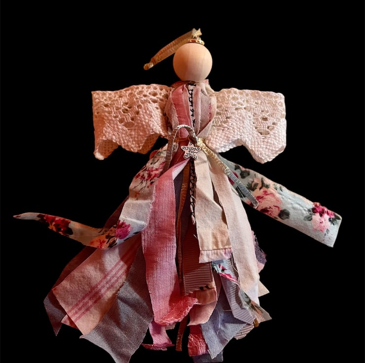 This enchanting set of two Scrap Angels has been thoughtfully created from the leftover fabrics used in my boho top designs, combined with reclaimed ribbon, beads and carefully chosen details. Each angel features a delicate charm engraved with the words “Just For You,” adding an extra layer of meaning to an already heartfelt gift.