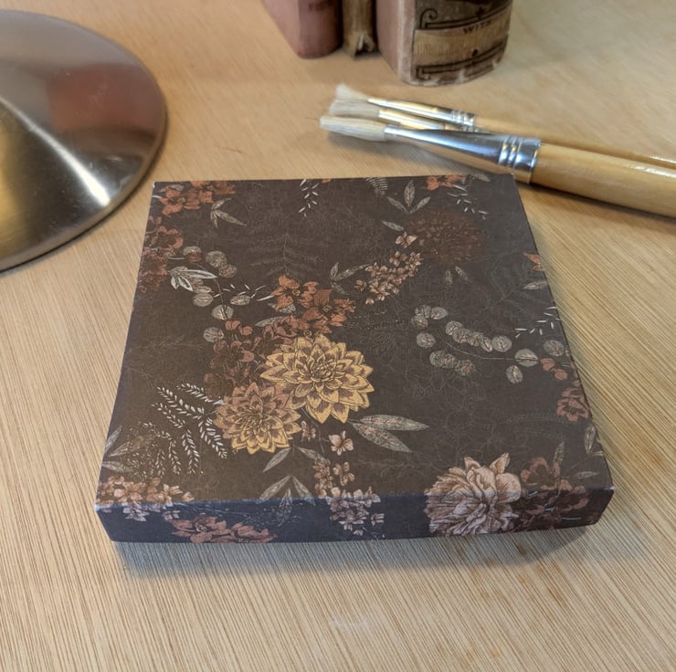 An ultra-thin, handmade gift box with separate lid covered in high quality paper from Cassie Suche's 'Perfect Allusion' series. The box is complete and ready to use, requiring no further assembly, and the paper completely covers the exterior and interior of both the lid and the base with no cardboard showing. It measures 10.6cm square closed. Outside height is 1.7cm and internal box depth is 1.5cm. Ideal for all items not requiring a deep box, such as delicate jewellery pieces, silk scarves, embroidered handkerchiefs, etc.