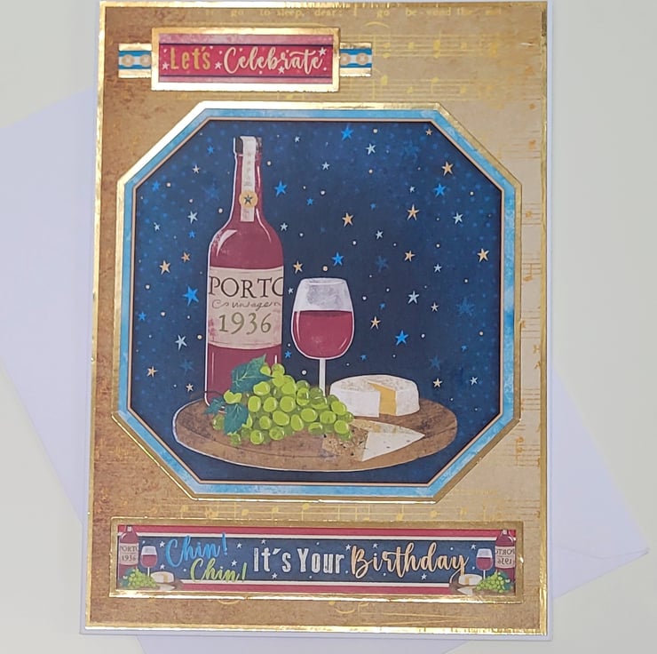 The card has two sentiments on the front which read “Let’s Celebrate” and “Chin Chin! It’s Your Birthday”