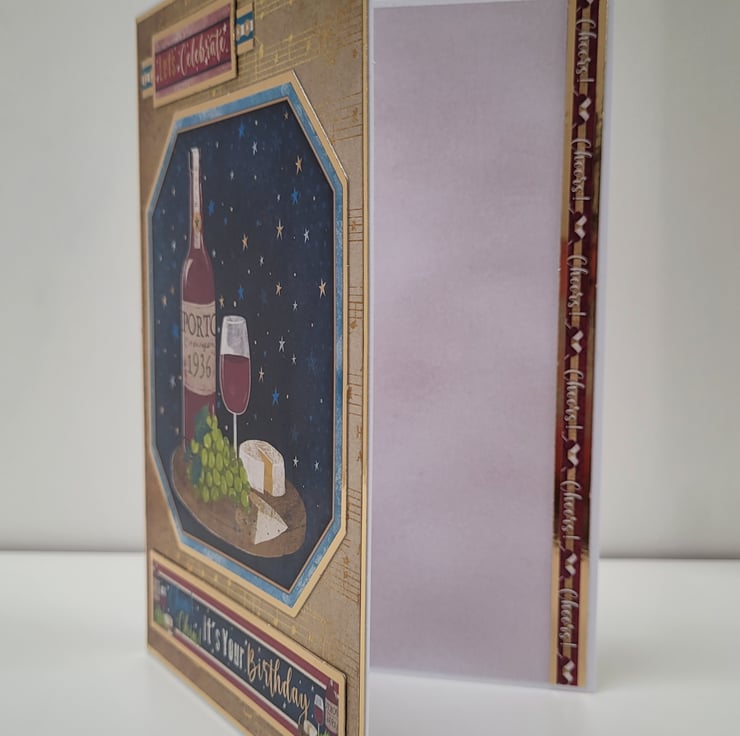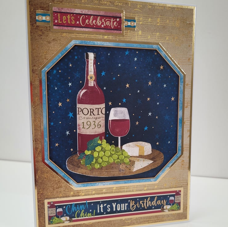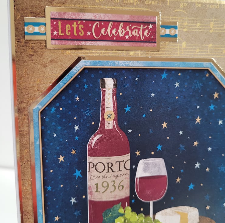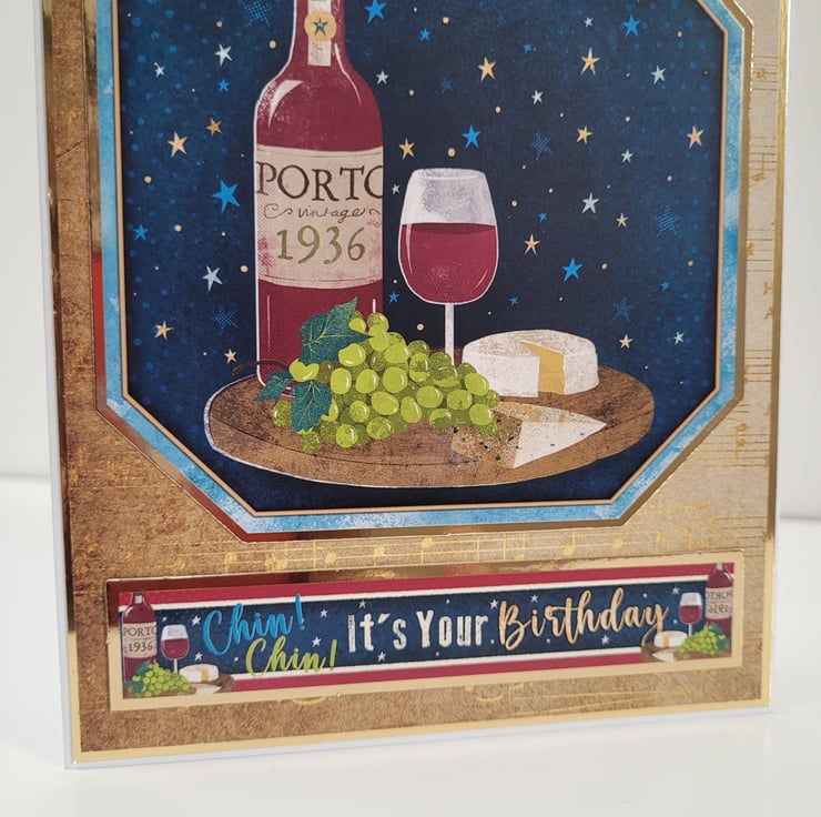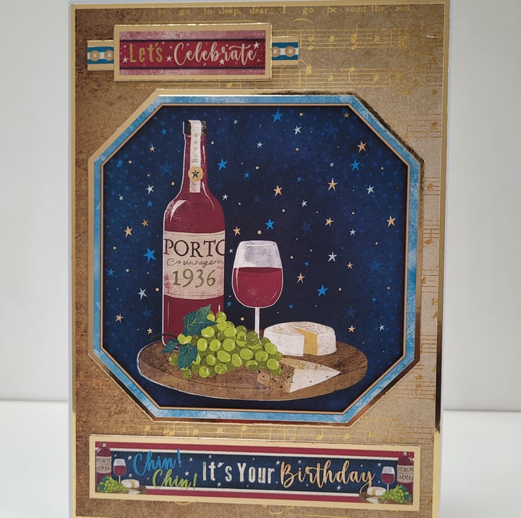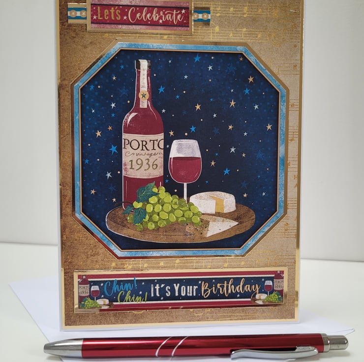 Featuring a beautifully illustrated bottle of Porto (1936), a glass of red wine, fresh green grapes, and cheese set against a starry night sky, this handmade card brings a touch of old-world charm to any birthday celebration. Gold accents and musical details add warmth and sophistication, making it ideal for milestone birthdays or anyone who appreciates fine wine.