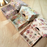An ultra-thin, handmade gift box with separate lid covered in high quality paper from Cassie Suche's 'Perfect Allusion' series. The box is complete and ready to use, requiring no further assembly, and the paper completely covers the exterior and interior of both the lid and the base with no cardboard showing. It measures 10.6cm square closed. Outside height is 1.7cm and internal box depth is 1.5cm. Ideal for all items not requiring a deep box, such as delicate jewellery pieces, silk scarves, embroidered handkerchiefs, etc.