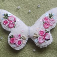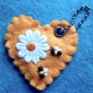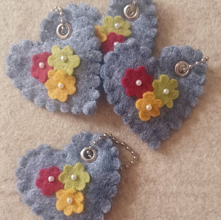 These lovely keyrings (or bag charms) are made with soft wool felt in a flecked grey shade. A floral design with contrasting colours has been added with pearl beads.