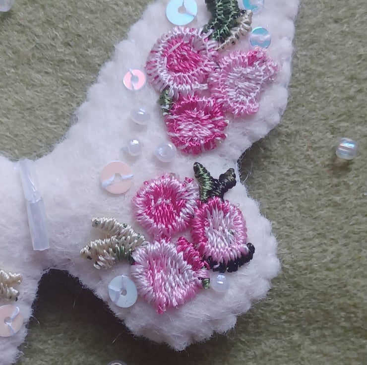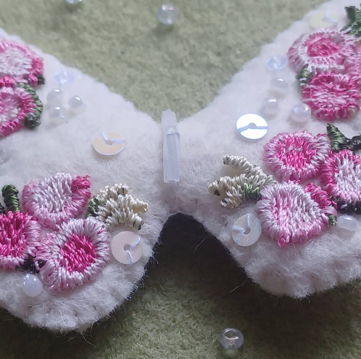 This beautiful butterfly brooch has a pretty pink cut embroidered lace stitched on with added sequins and beads that will catch in any light.