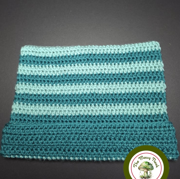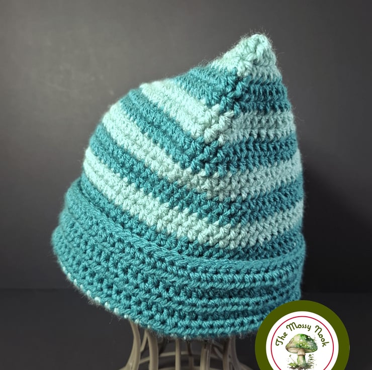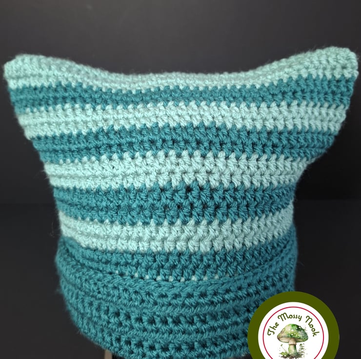 This cute cat ear hat is hand crocheted using a lovely soft, acrylic yarn in stipes of mint and teal green. The cuff is not fixed, allowing you to shorten or lengthen the hat to your choosing