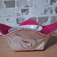 The cosy is made with cotton fabric. One side with different colourful fruit and the other side is in a plain cream colour. It also has two layers of cotton batting between the fabrics. However, I DO NOT RECCOMMENT MICROWAVE USE. The reason I say this is that the thread I sew with is polyester which is unsuitable for the micrawave.