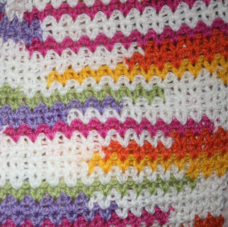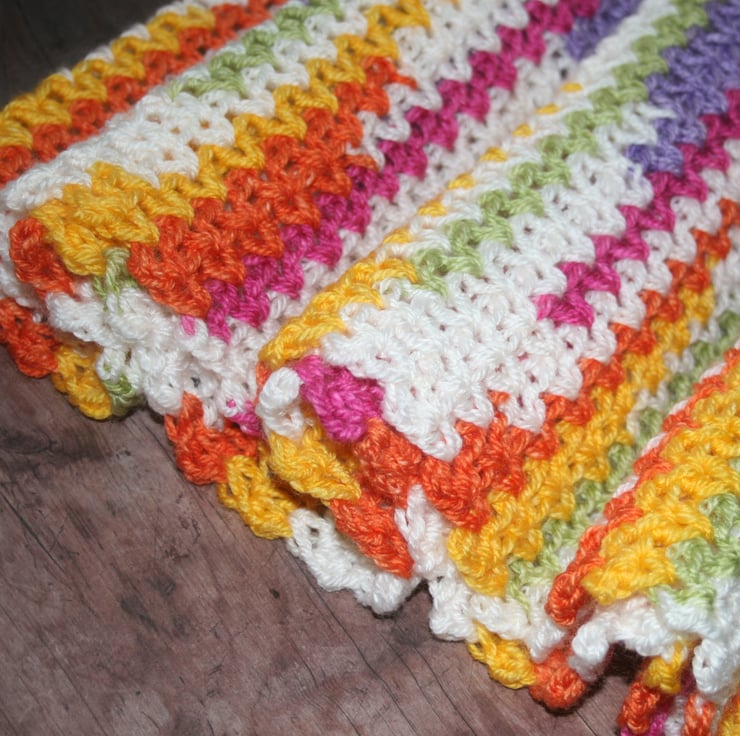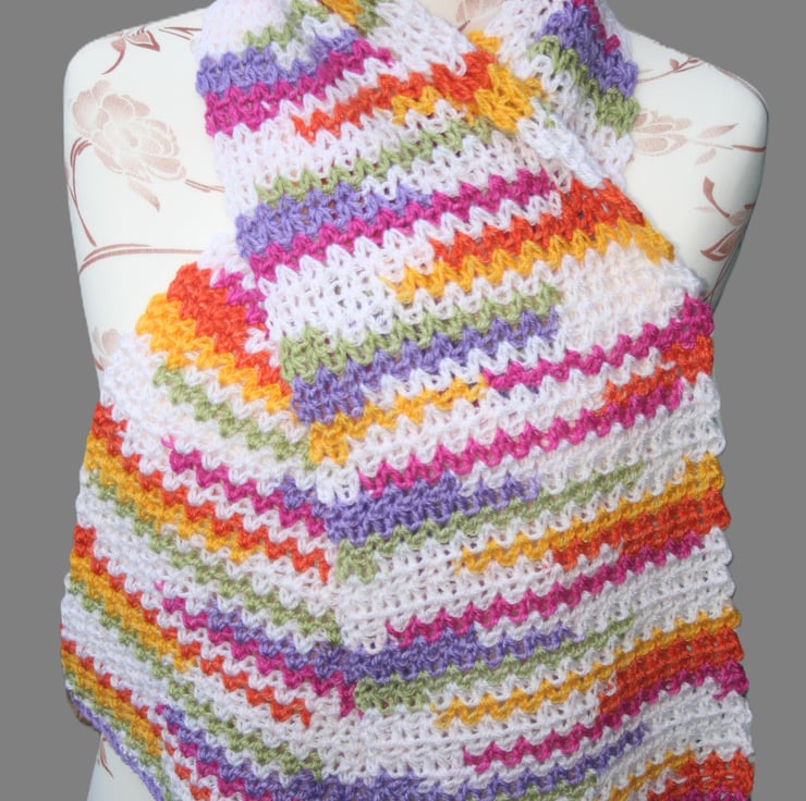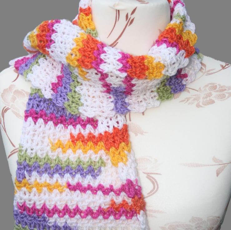A pretty and very soft crocheted scarf of rainbow colours: purple, pink, orange, yellow, green and white. It is made of 100% Premium Acrylic and washing instructions will be sent with your purchase. Made with kind permission of the original pattern designer. The scarf measures approximately 53 and a half inches (L) and eight and a half inches (W). Whilst I have made every effort t capture the true colours it may appear slightly different on your computer screen.