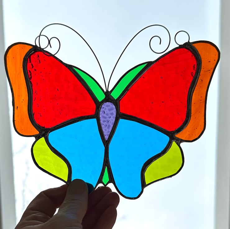 This lovely handmade butterfly has been made from a variety of different shades of vibrantly coloured stained glass