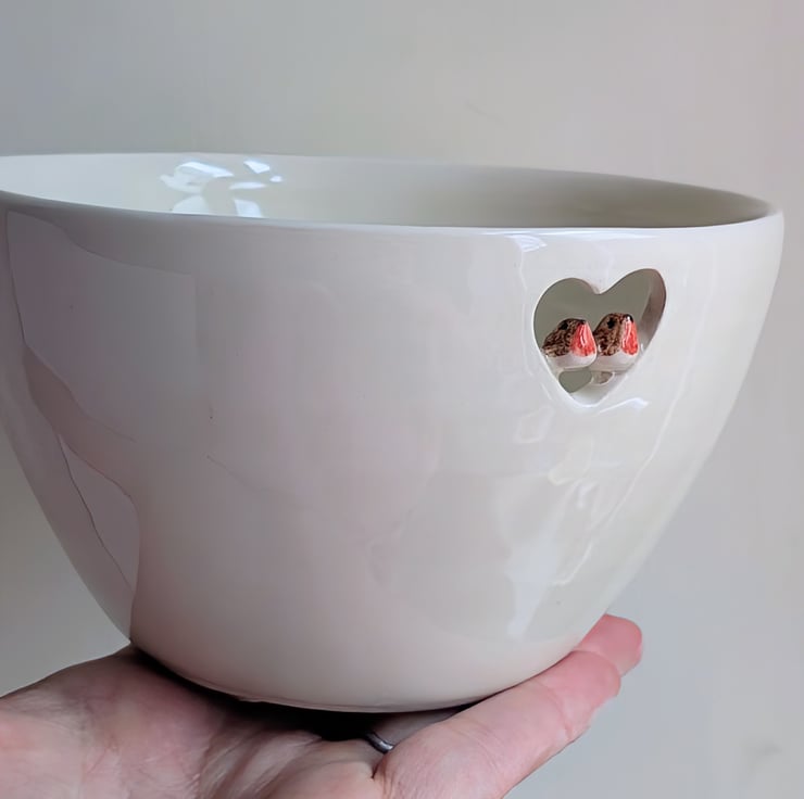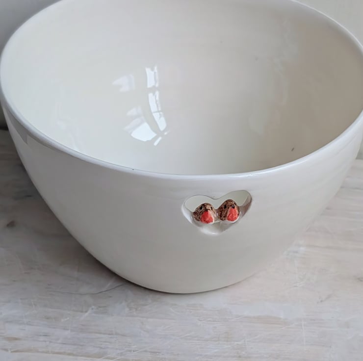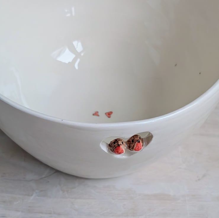 Ceramic handmade robin couple bowl. There are tiny hand modelled birds, a heart cut out, and bird prints. This bowl is part of the Perfectly Imperfect sale due to a bubble in the glaze, please see pictures.