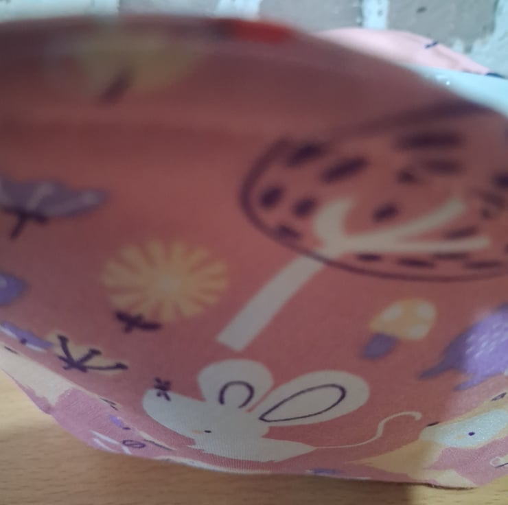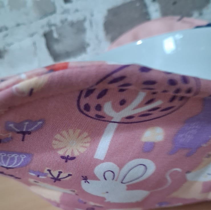 The cosy is made with cotton fabric. One side is made with a pink coloured fabric featuring woodland animals and the other side has a flowered pattern, the main colour being pink. It also has two layers of cotton batting between the fabrics. However, I DO NOT RECCOMMENT MICROWAVE USE. The reason I say this is that the thread I sew with is polyester which is unsuitable for the micrawave.
