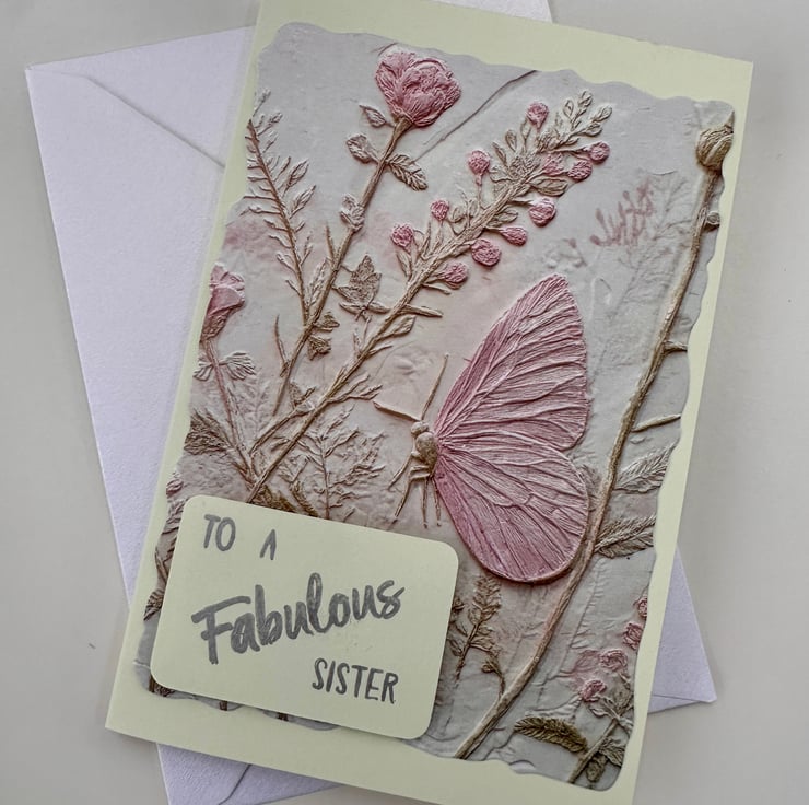 Happy birthday fabulous sister card, pastel green, embossed, floral, butterfly