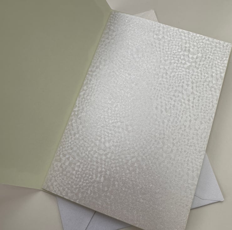 Size: 11x 15.5cm, it has a premium ivory envelope with a beautiful sheen. Inside is a shiny lightly patterned paper insert with a gorgeous sheen, plain on the inside for that extra special touch to write your own message on.