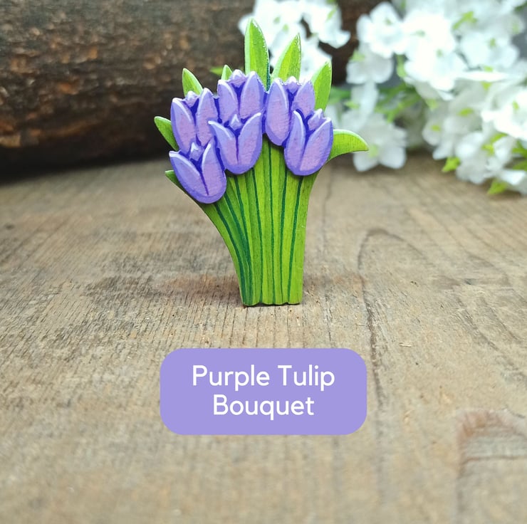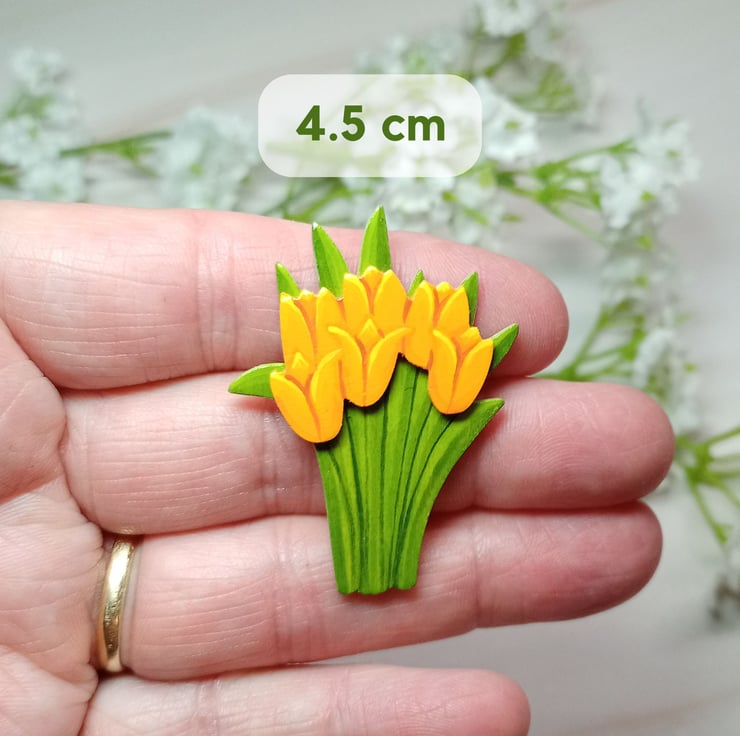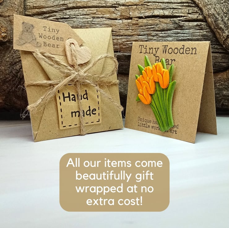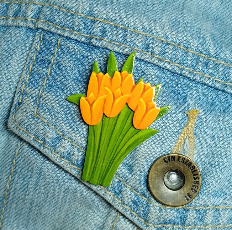This charming hand-painted orange tulip bouquet brooch is crafted from two layers of wood, creating a beautiful 3D effect. It's lightweight enough to wear on delicate fabrics while remaining durable enough to be a cherished keepsake. In the language of flowers, the orange tulip means a sense of understanding and appreciation between two people. For an extra personal touch, you can even have the back painted with a name, date, or special message. It's not just a brooch, but a lasting memory to treasure!