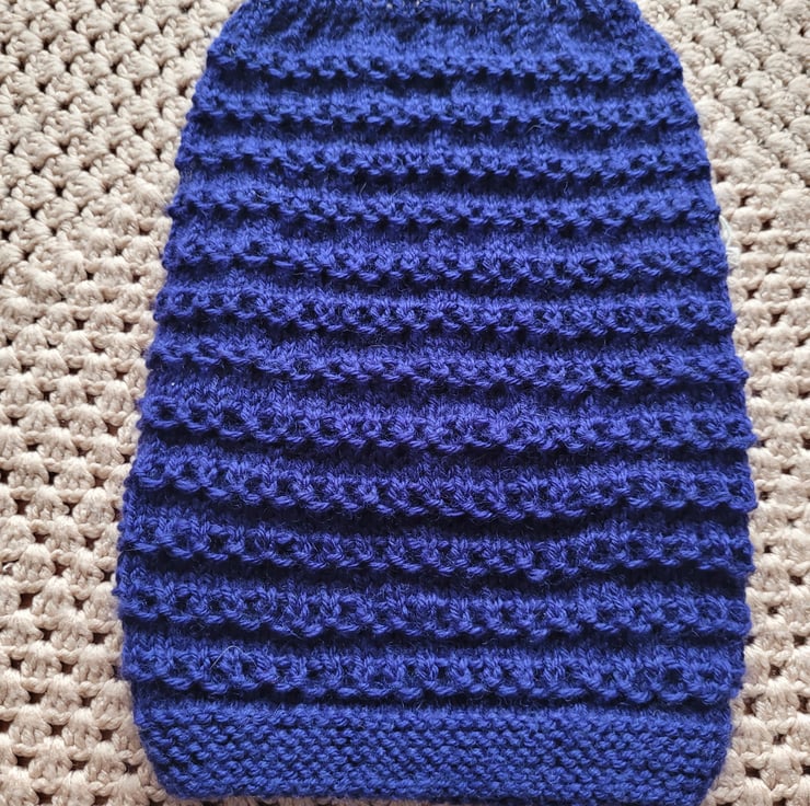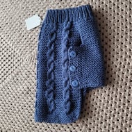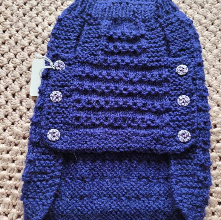 Hand knitted dog coat in indigo, in a honeycomb pattern with pink and white flower buttons. Size XS. Length 10 inches .chest 14 inches. One for the girls. Machine washable on low settings.