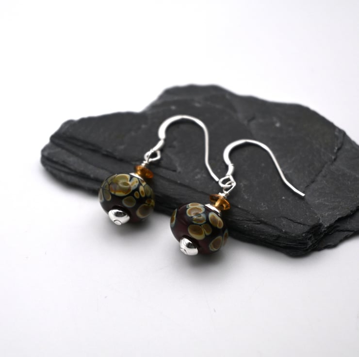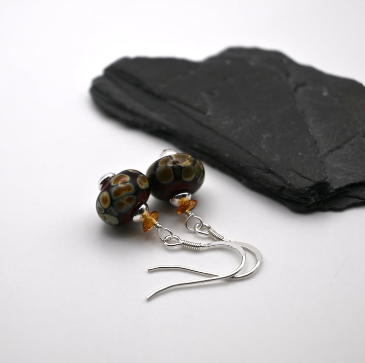 A pair of sterling silver earrings which feature handmade lampwork brown raku glass beads, sterling silver beads and Citrine gemstone beads.