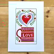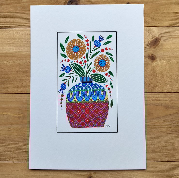 Add a pop of joyful colour to your home with this hand painted folk art piece! An original painting featuring a beautifully patterned red and blue vase of flowers with stylised blooms and poppy heads. Hand painted it would be a perfect gift for birthday, Mother's Day or for any lover of folk art and flowers. Perfect for a gallery wall or a cosy kitchen nook it’s been handmade with love and ready to find its forever home.