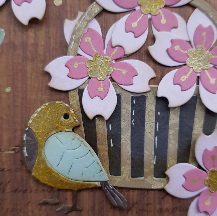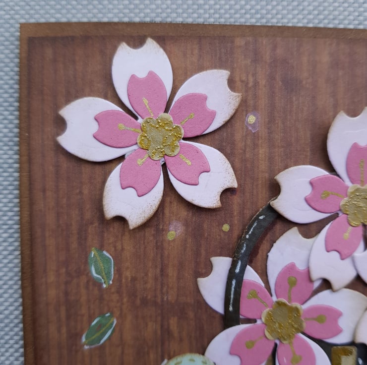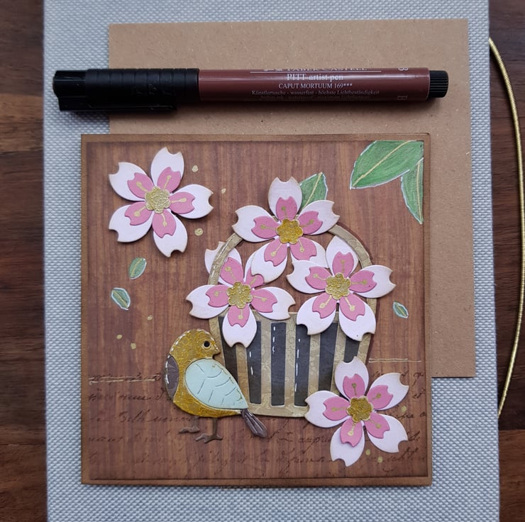 The front panel of the card and the different elements of the composition have been inked on their edges for a vintage, cosy look. I created the blossom from two different shades of pink paper and added foliage using metallic green acrylic paint.