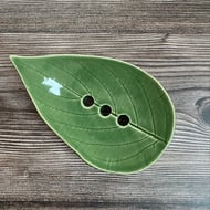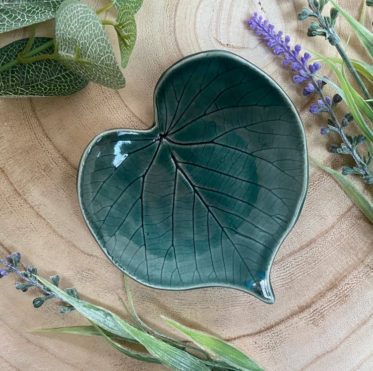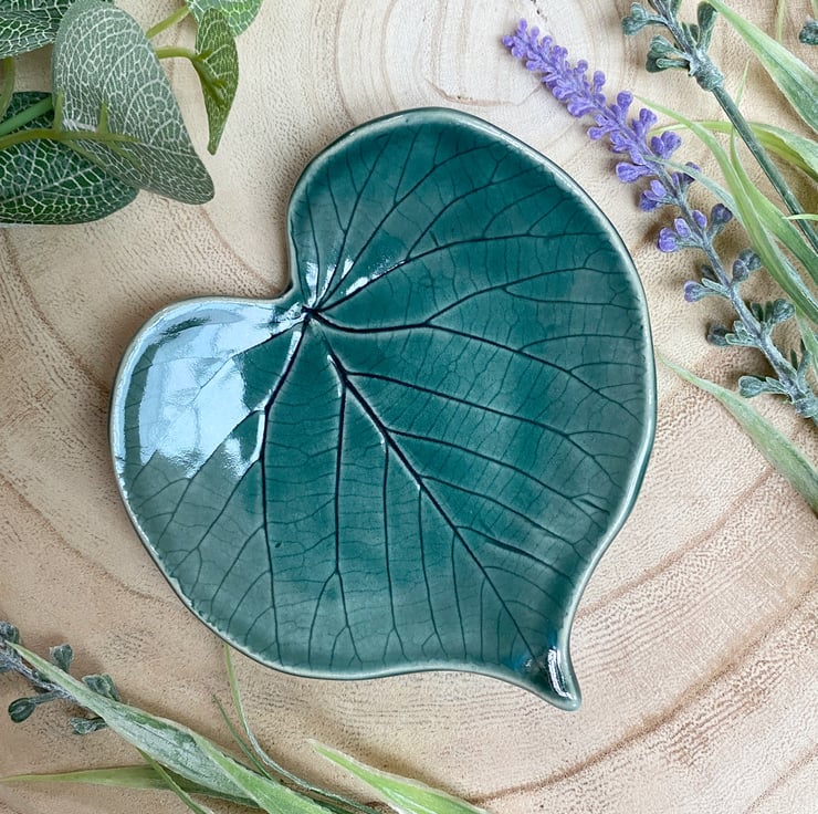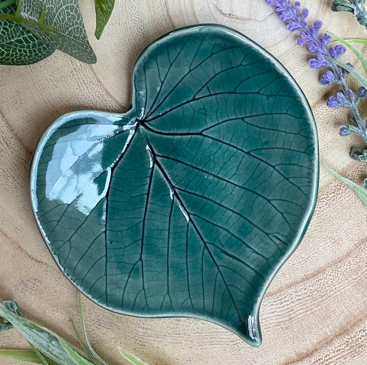 This green leaf dish has been made using creamy stoneware clay. A real leaf was impressed into the clay to form the texture. It has been glazed in a rainforest green glaze.