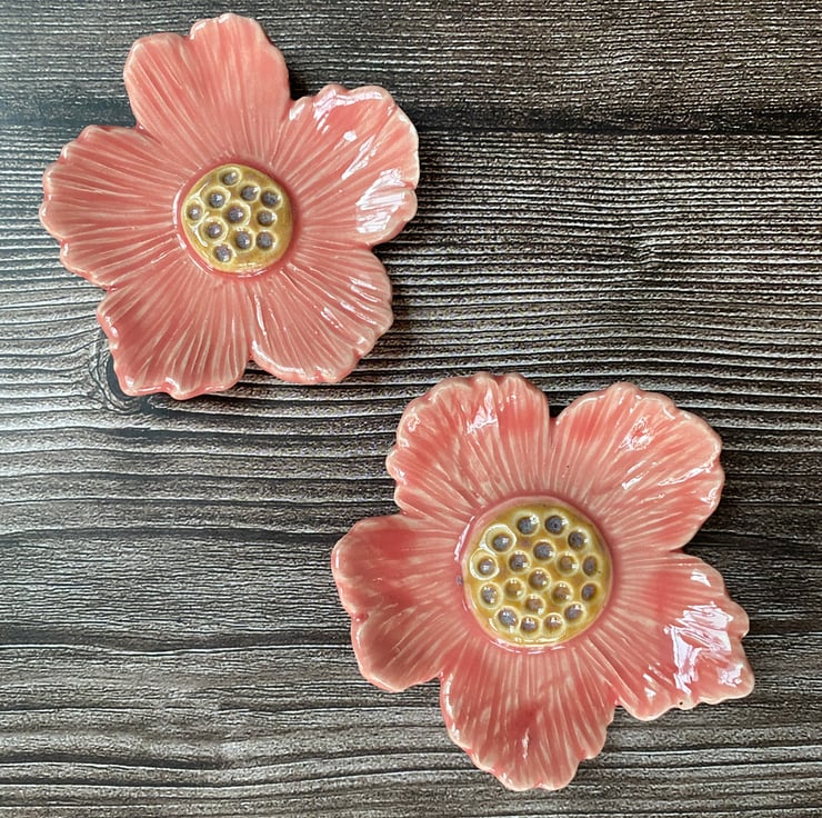 I made these small pink flower dishes, meant for earrings or rings as they are so small, using stoneware clay and pink and amber glazes. Can be used a purely decorative too.