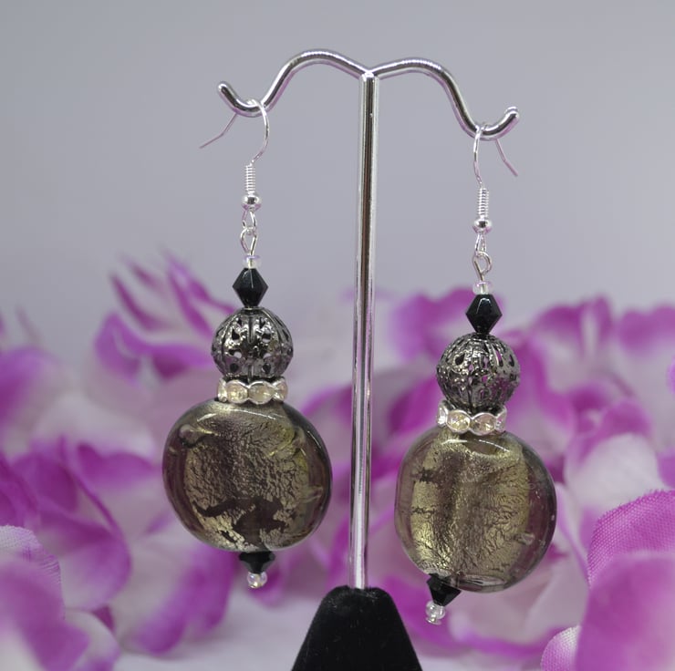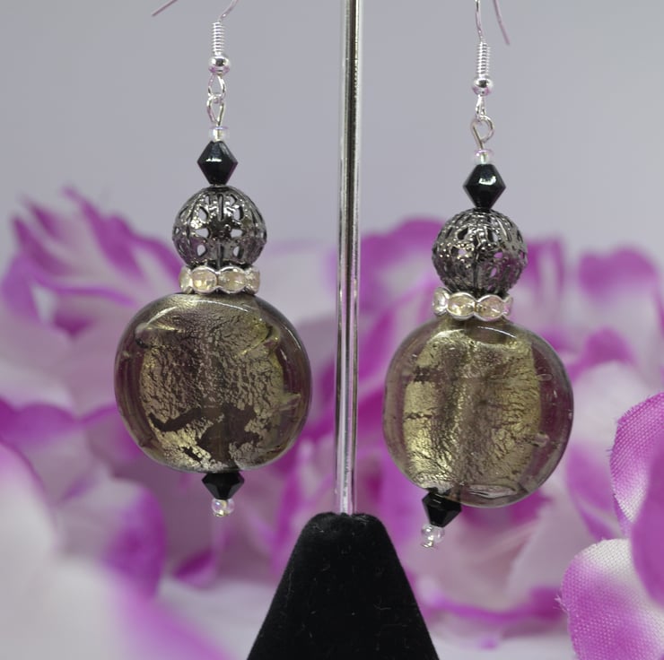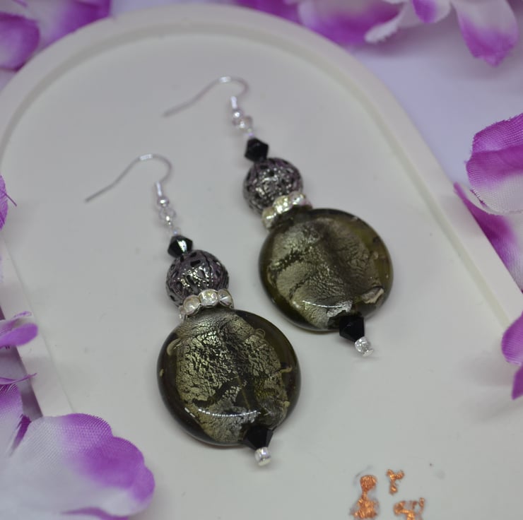 If you like long, chunky earrings, these are are for you. With a large Murano style silver lined grey glass bead approx. 2.5cm in diameter, these earrings are sure to make a statement. As well as the large bead, these earrings also feature black glass bicones, crystal effect rondels and dark grey metal filigree beads. The ear wires are silver plated but can be changed at checkout for those with allergies or just personal preference. As they are already made, they are available for immediate dispatch.