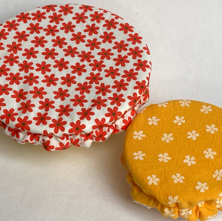 - one small bowl cover, ideal for leftovers. Fits bowls approx 16cm in diameter. The fabric is a cream cotton decorated with orange flowers. The lining is white PUL.