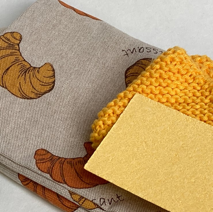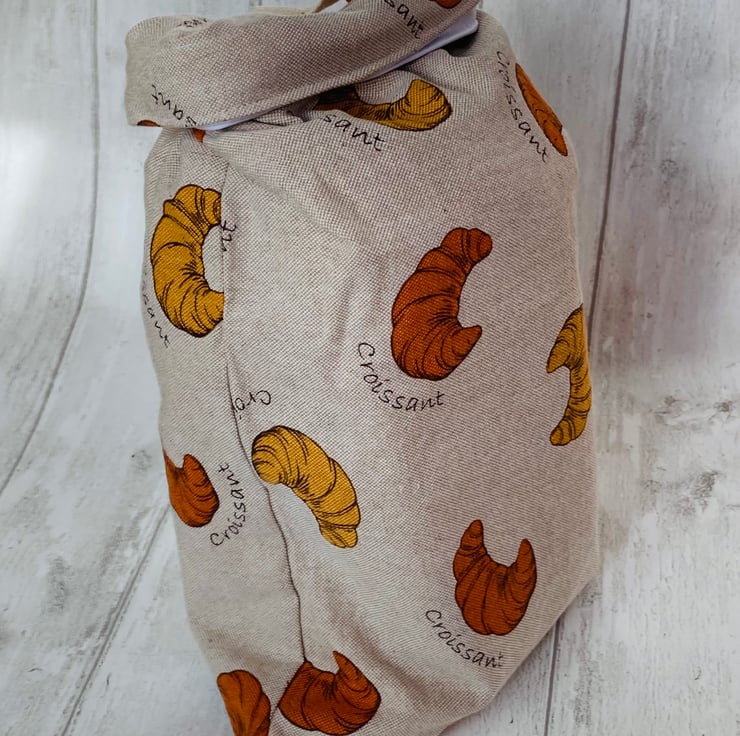 - Bread bag. Beige linen-look fabric decorated with orange and yellow croissants and lined with white or yellow PUL. (see below) Medium 25 x 40cm. Large 27 x 50cm.