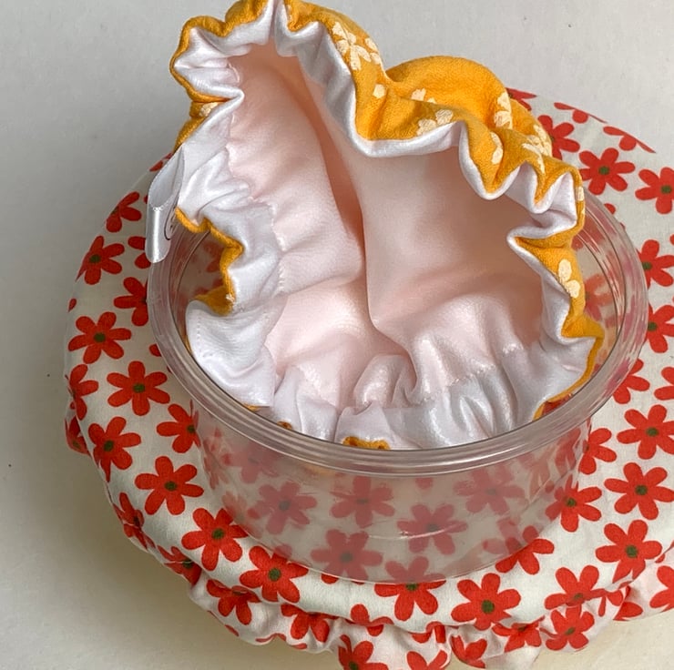 - one extra small bowl cover ideal for pots of dips approx. 9 - 11cm diameter. Made from a yellow cotton with small daisy design designs. Lined with white PUL.
