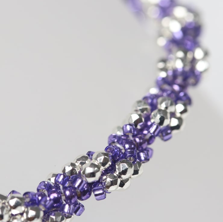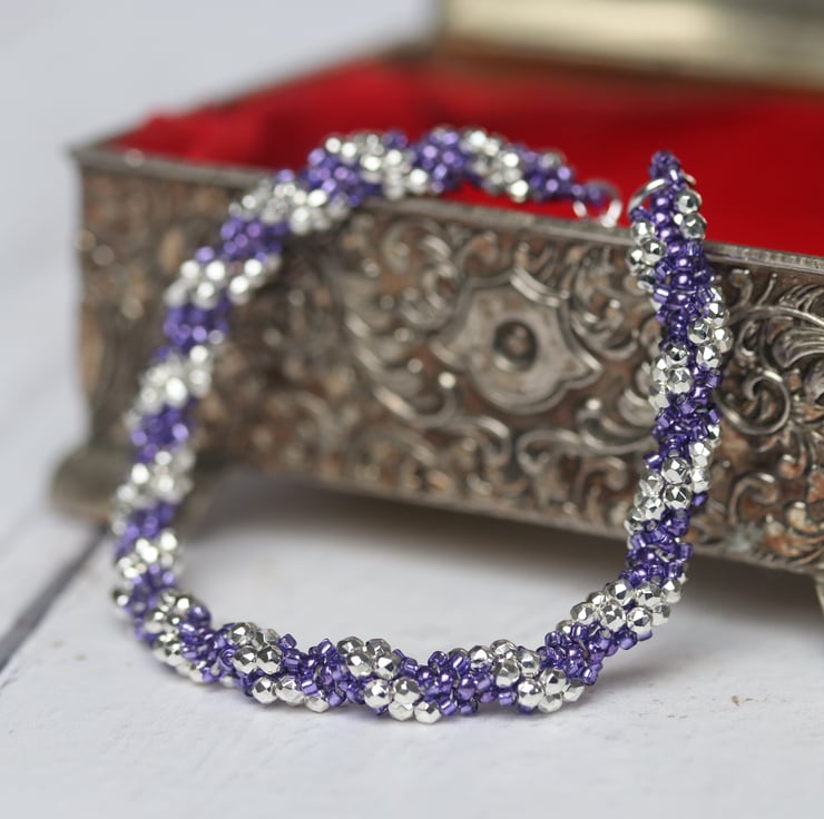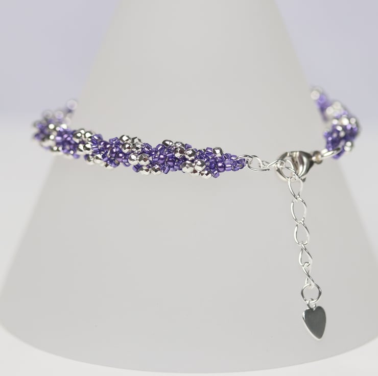 A very sparkly little bracelet; perfect for a party or prom. It’s a bit of a return to my roots for me as I have made this using the first beadweaving stitch I learned, sometimes called the spiral step. I have used sparkly silver micro crystals alongside pretty metallic purple size 11 and 15 seed beads. The findings (metallic bits) are all in sterling silver. This includes an extension chain with a pretty heart detail to give flexibility of size. This bracelet should sit well on any wrist between 6ins (15.2cms) and 7ins (17.8cms) in circumference. It is fastened with a trigger clasp.