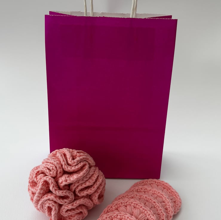 Bath/shower spa gift set. Includes shower/bath puff, set of 5 reuseable face scrubbies & a coloured gift bag.