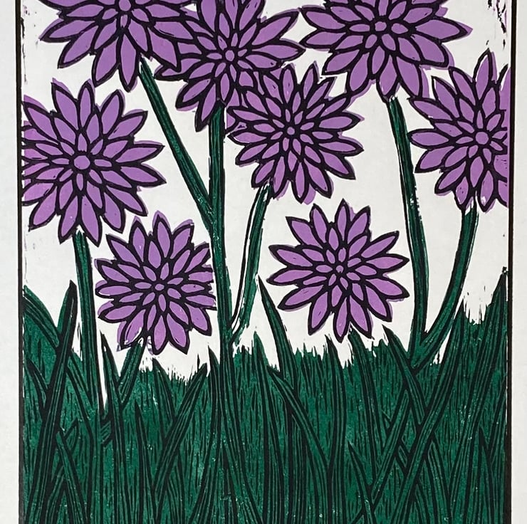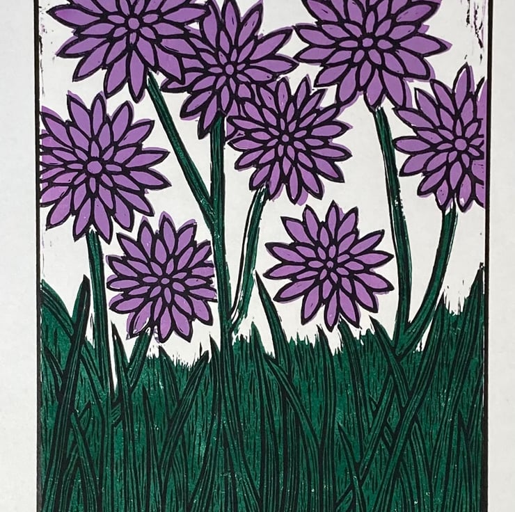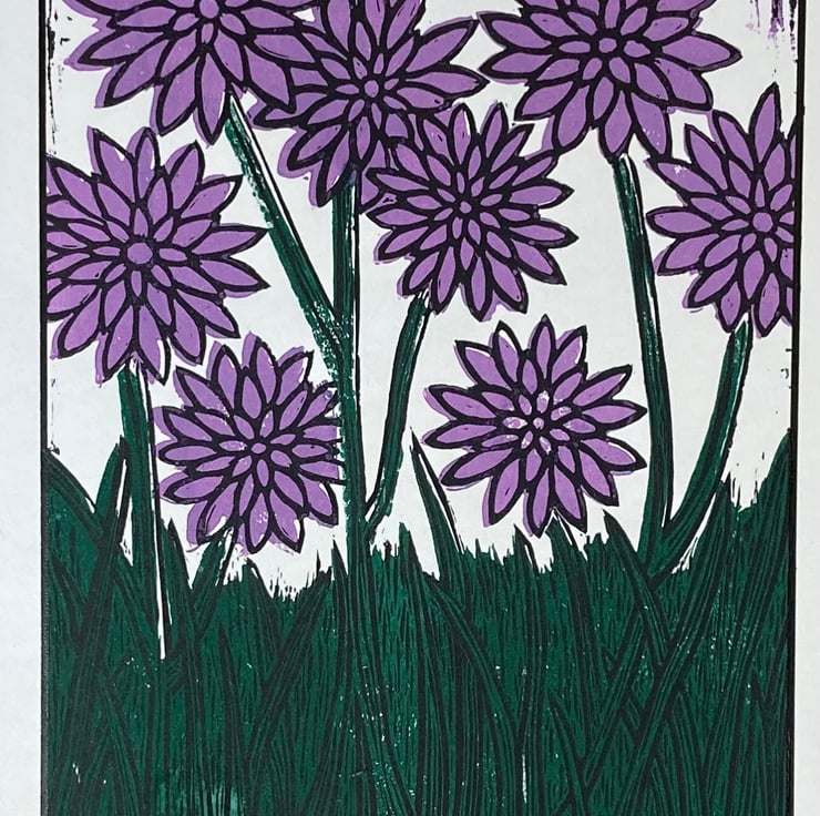This is a lino cut picture of dahlia flowers was inspired by watching dahlia's growing in my garden.