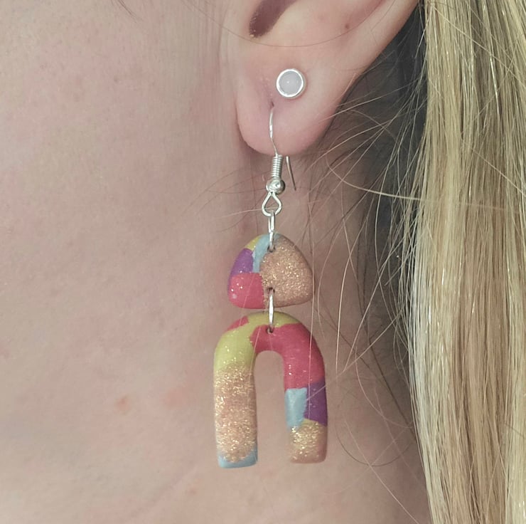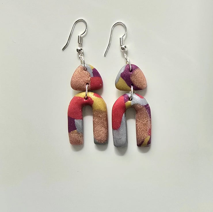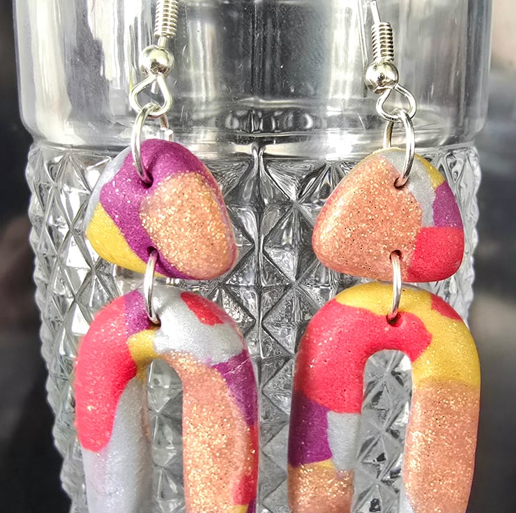 A pair of dangle earrings lovingly made with polymer clay. All earrings come on silver plated ear hooks and are presented in tissue and in an organza bag ready to gift to yourself or someone else.