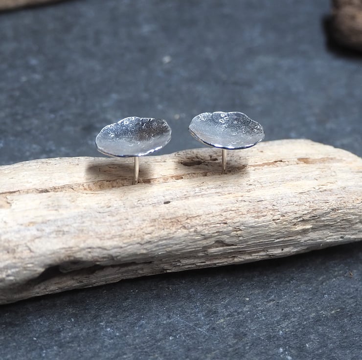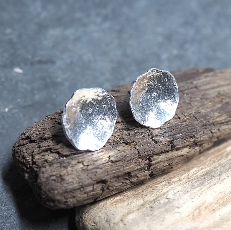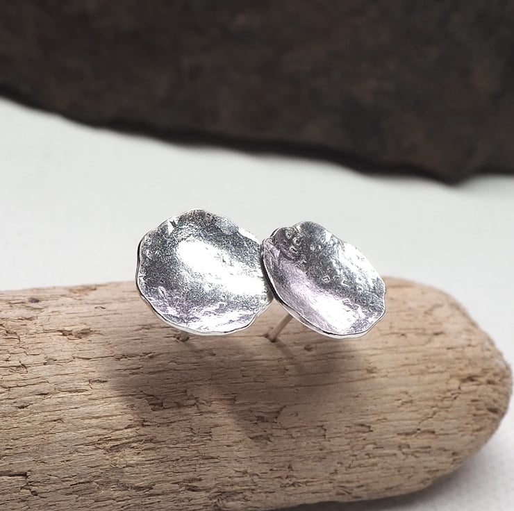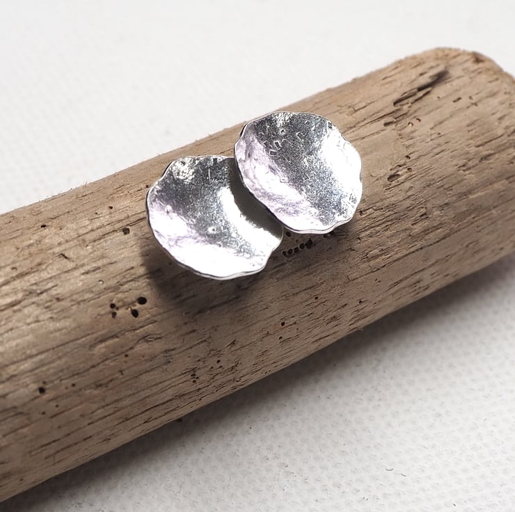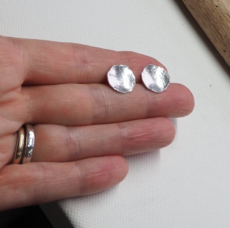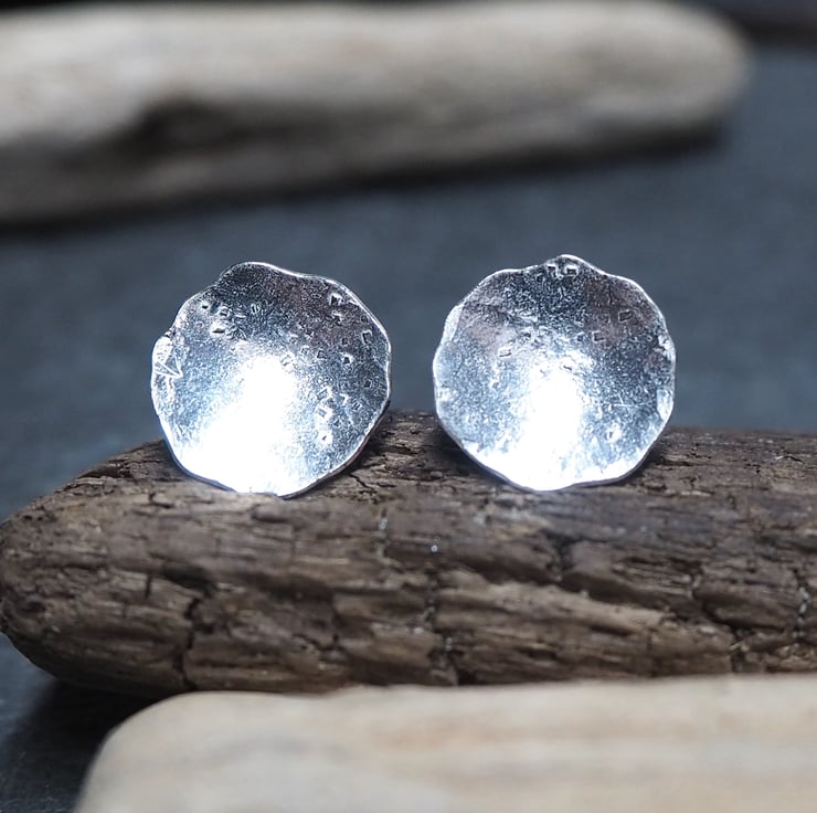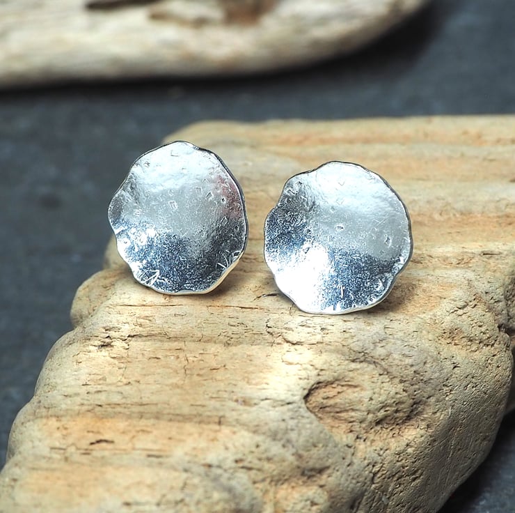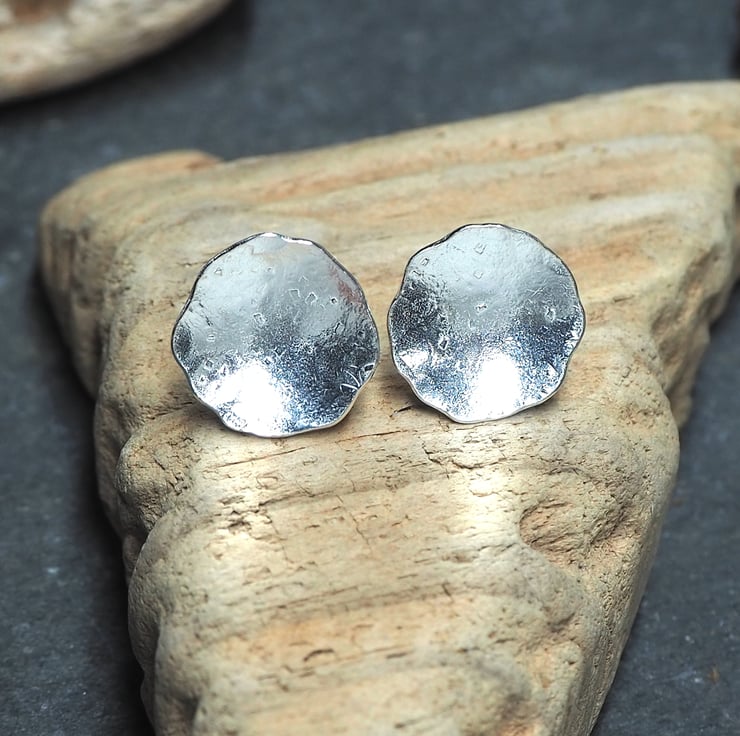 These large silver stud earrings have been formed by heavily beating the silver with a vintage hammer. This distorts the silver creating a lovely organic, slightly domed shape with an interesting texture and uneven edges. The silver has been polished to a bright shine to finish.