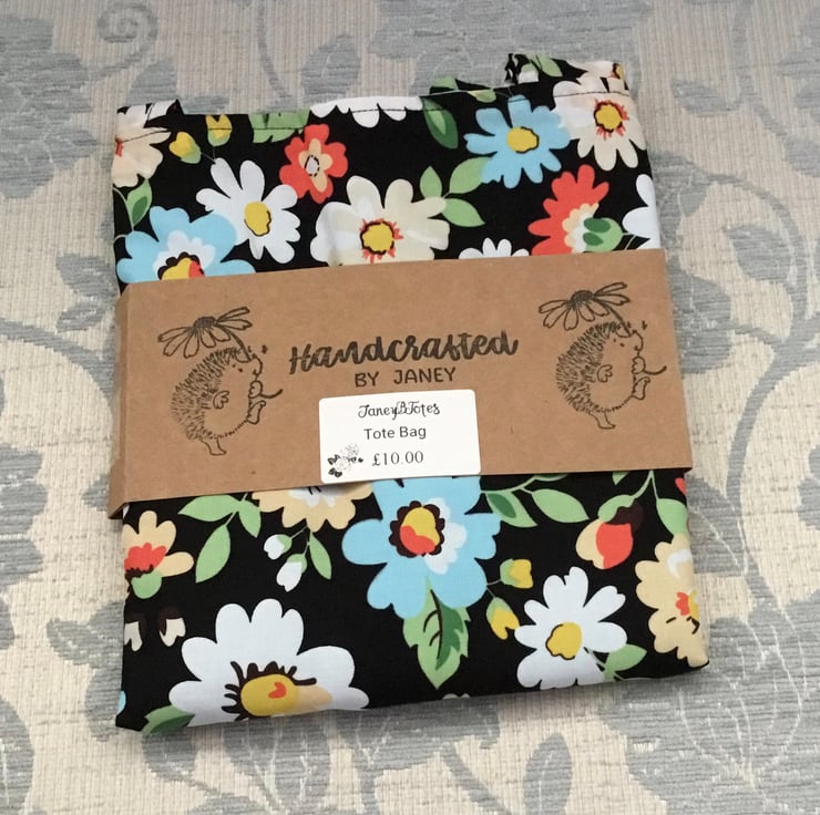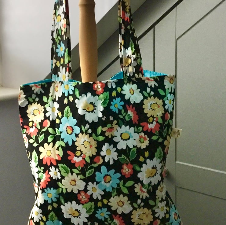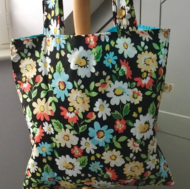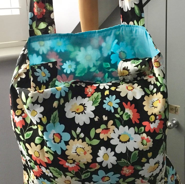 Large tote bag in a cotton daisy printed fabric which is fully lined with a contrasting light blue fabric.