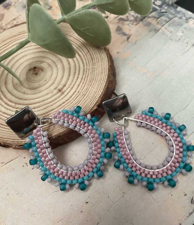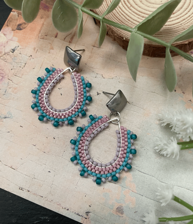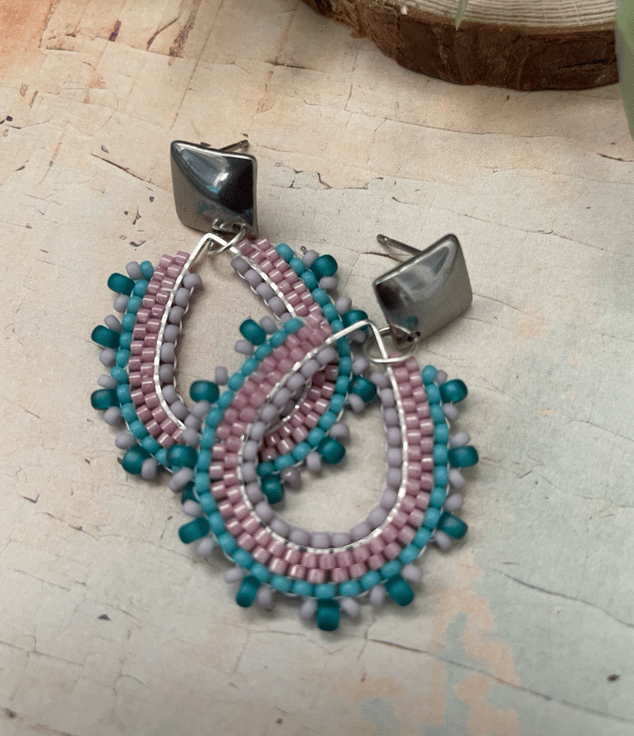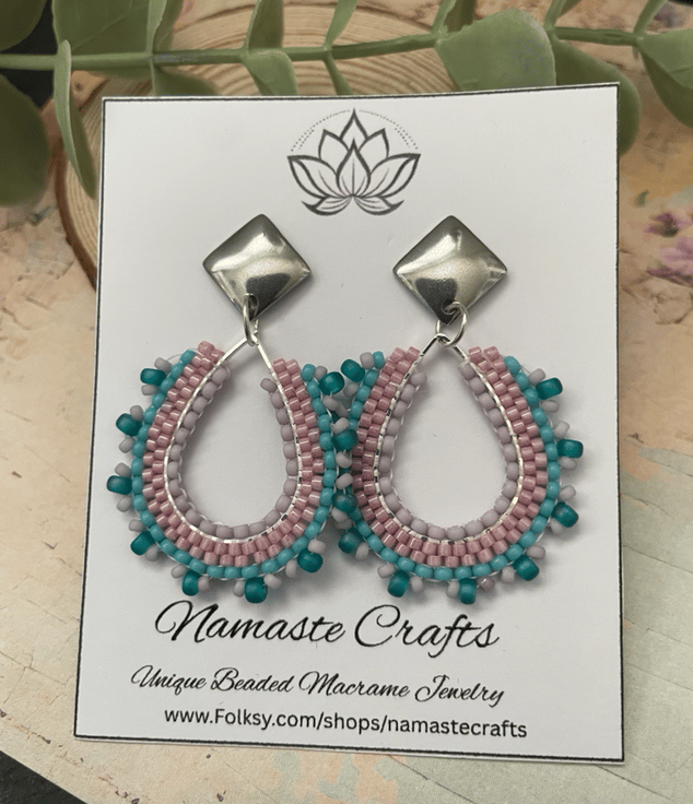 Parallel rows of Czech glass seed beads have been hand woven to outline the silver teardrop shape creating a beautiful pair of earrings that encompasses handcrafted, one-of-a-kind beauty ready to gift to that special person or to keep.