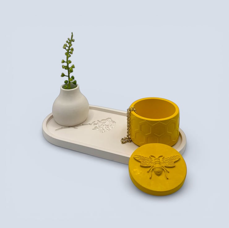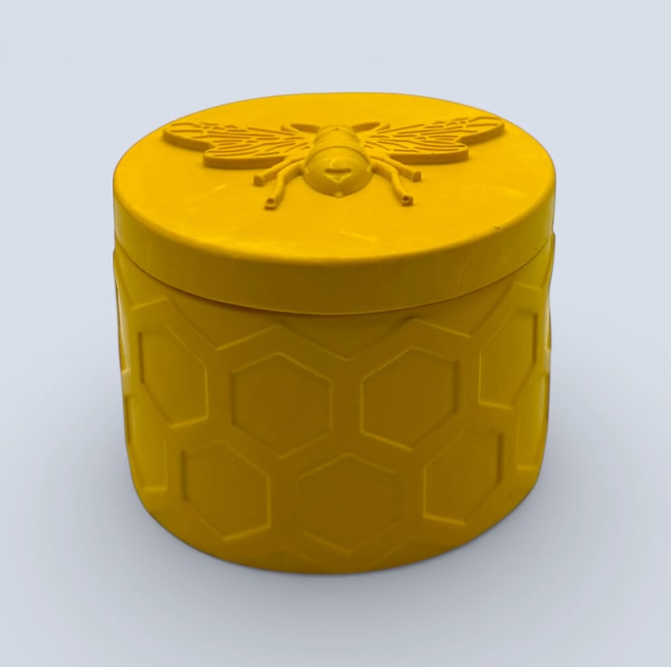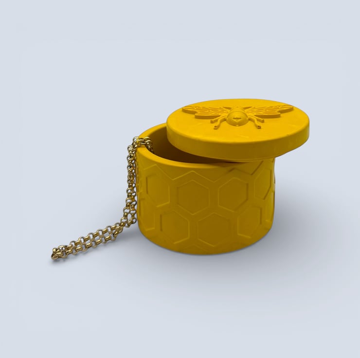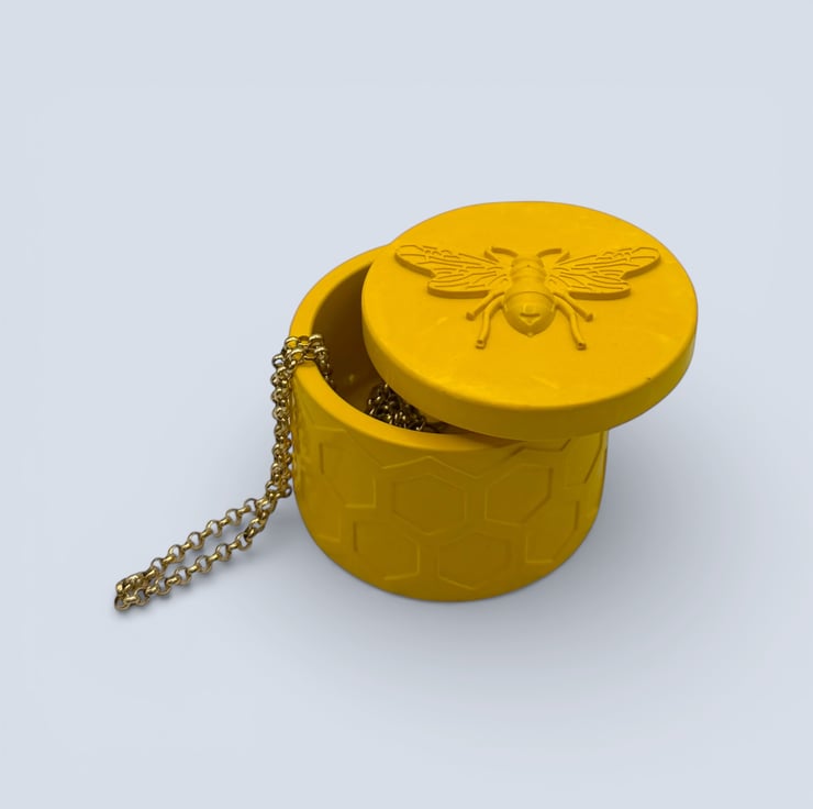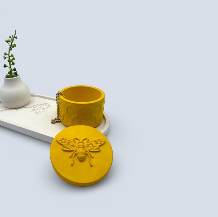 This bright, cheerful jewellery box features a repeating honeycomb texture around the exterior, finished with a raised bee detail on the lid. The bold yellow colour makes it an eye catching piece that works beautifully as a small gift or a playful accent for a shelf, bedside or dressing table.