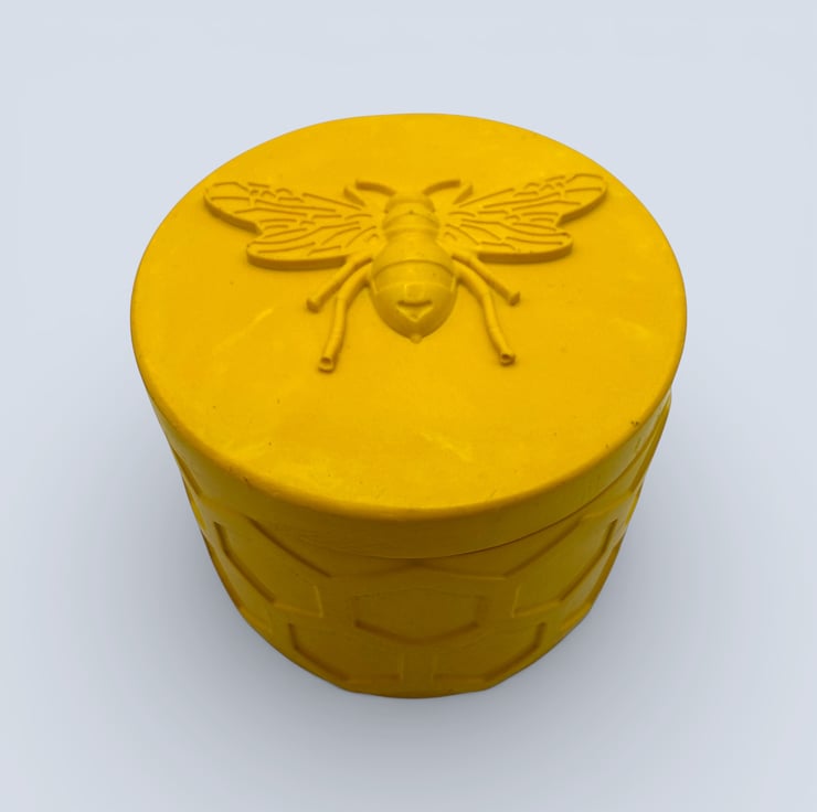 Yellow jewellery box with a honeycomb pattern and raised bee lid, handmade as a decorative storage piece for jewellery, keepsakes and small treasures.