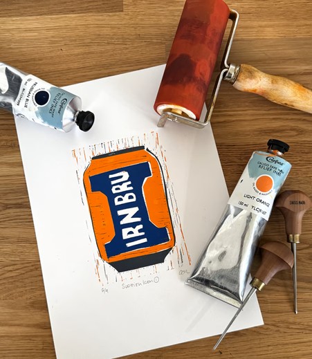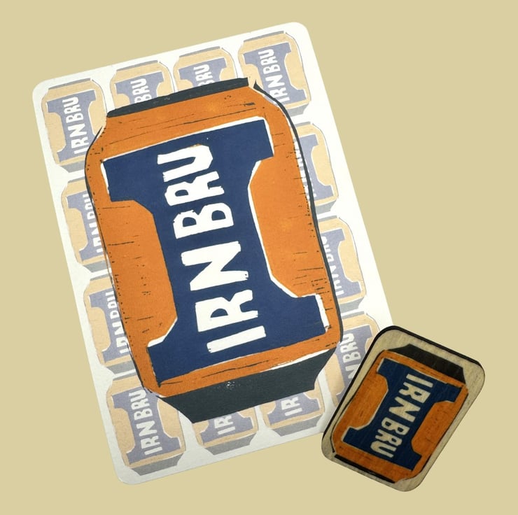 A gift set of an Irn Bru pin badge and postcard. The design is from one of my original linoprints, and has been digitally edited prior to being printed onto maple 3mm ply and laser cut. Once through the printing process they have been hand sealed with a polyurethane finish.