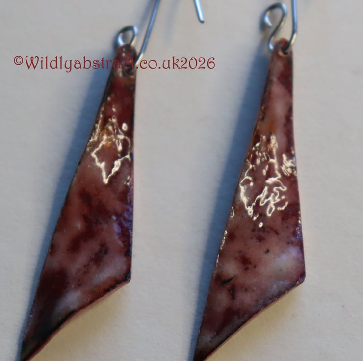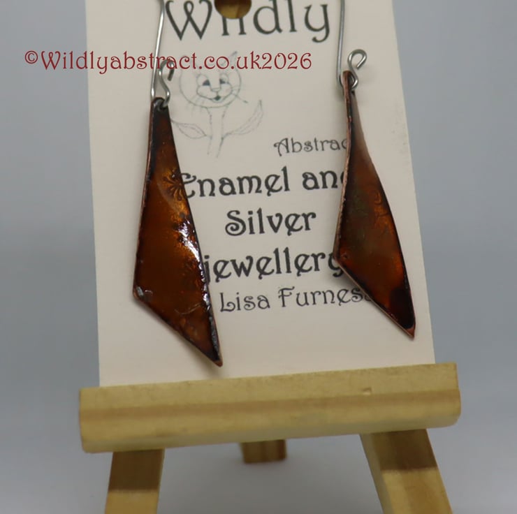 These earrings were hand-crafted with a triangle punch and manipulated into a twist using hand-pliers. They feature golden transparent enamel and stainless steel ear wires. The earrings were counter-enamelled to provide a professional and durable finish. A vibrant piece of jewellery for any occasion.