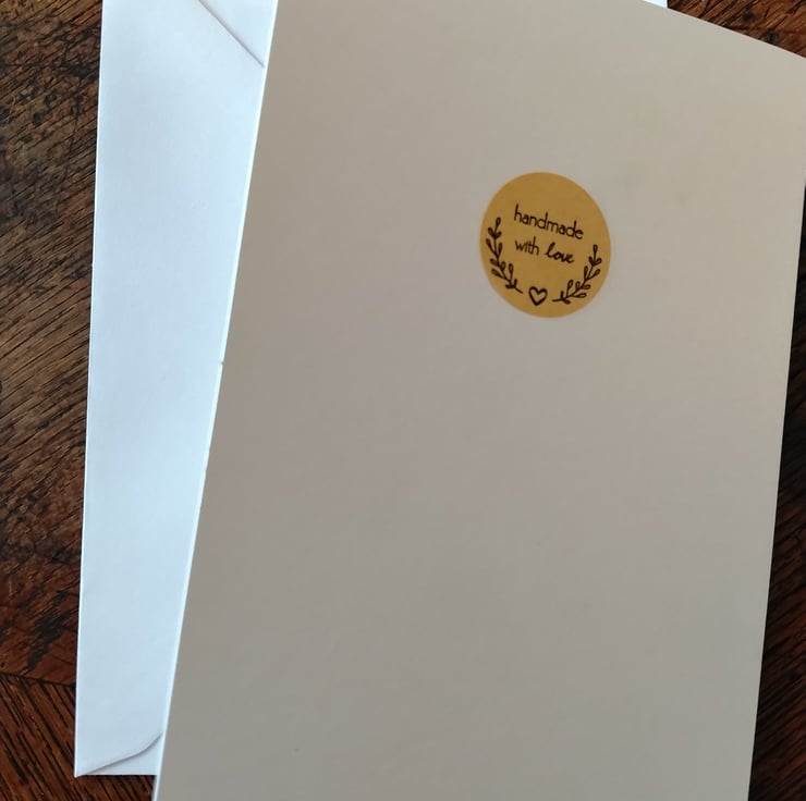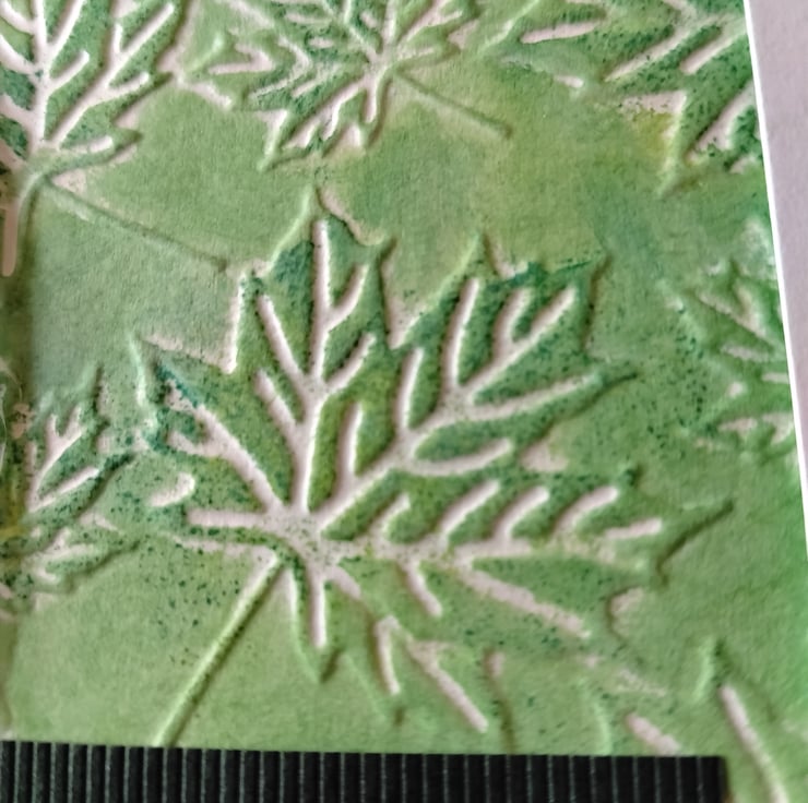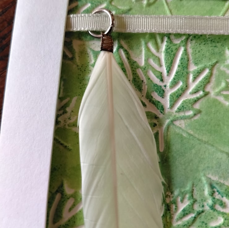 A6 card with white border, with embossed maple leaves, hand decorated with green ink to enhance the design. A white feather is attached with a metal jump ring and cream coloured ribbon. The wording on the card reads "A white feather will appear when a loved one is near". Blank inside for your own message. Supplied with matching white envelope.