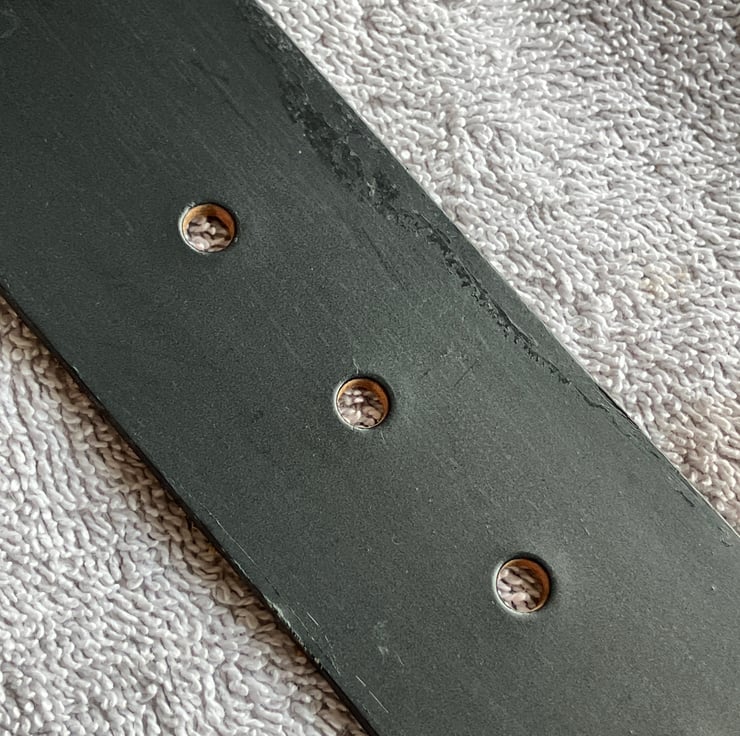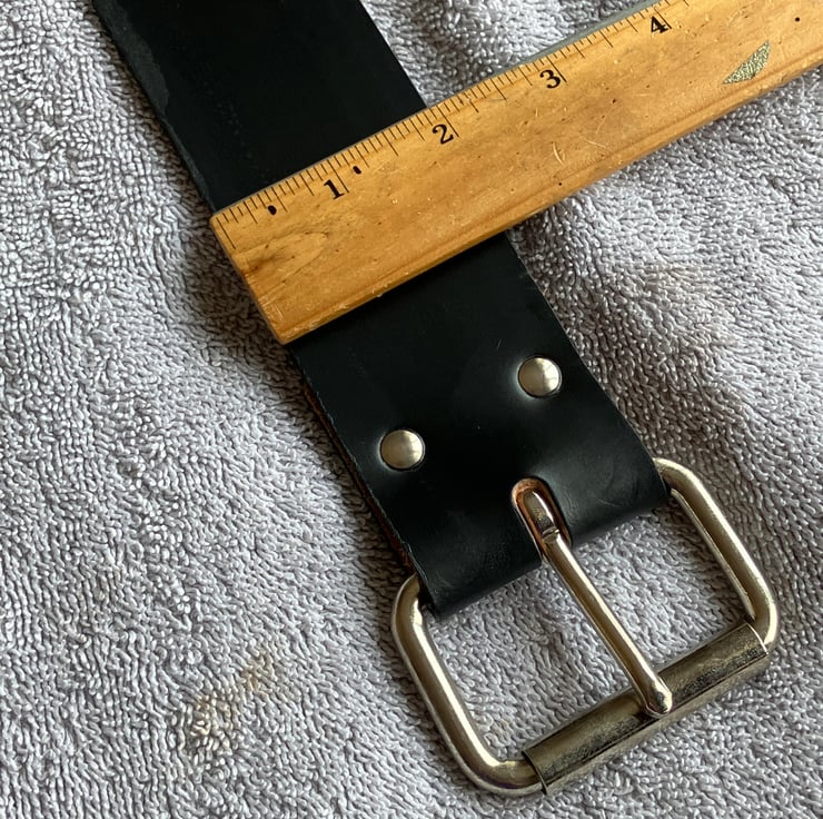 Leather weight is a firm 3-4 oz. Buckle is held in place with 2 rivets and has a chrome/silver finish. There are some slight imperfections in the leather (see photos) and the belt has been priced accordingly.