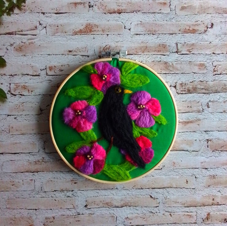 Felted into emerald green polycotton fabric , bright pink and mauve flowers , lime green leaves and a blackbird with a lovely yellow beak .