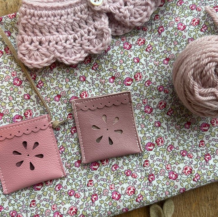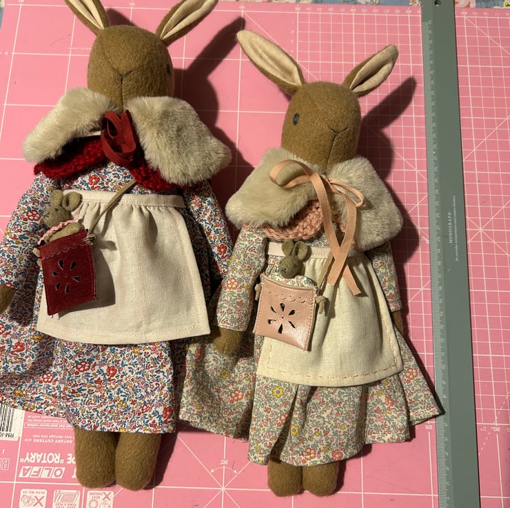 Her accessories include a cotton/linen apron embroidered with tiny running stitches and a little sprig of flowers. Her leather bag is hand punched with a little flower design and contains a tiny baby bunny. Her crochet cape is made from pretty mauve yarn to complement her dress and is fastened with a mother of pearl button. She has a fur cape, also lined in Liberty Eloise with a little ribbon tie.